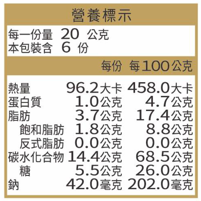 採用花蓮糙米與花蓮黑秈米組成的養生米黑米香,採用花蓮糙米以膨發製成,非油炸且加入部分海藻糖降低甜份,研發具有臺灣特色風味的養生米香❗