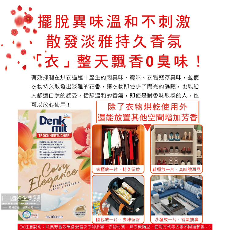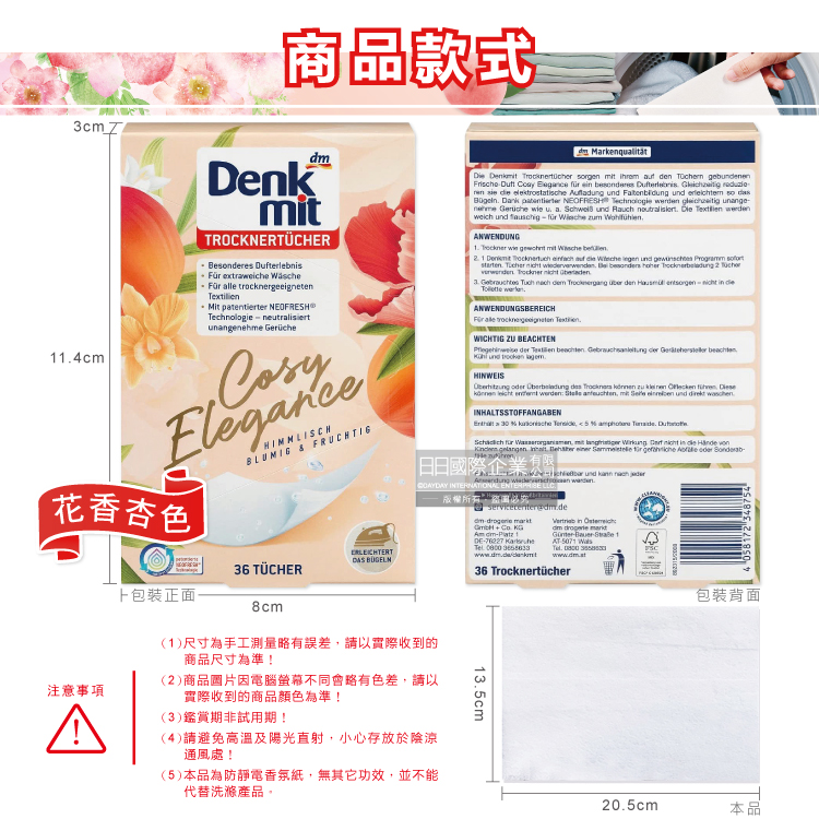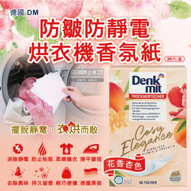 [日日好物]德國DM(Denk mit)-烘衣機專用衣物柔軟防皺除臭去靜電香氛紙-花香杏色36片/盒(防靜電烘衣紙,烘衣香片,香薰柔順片)