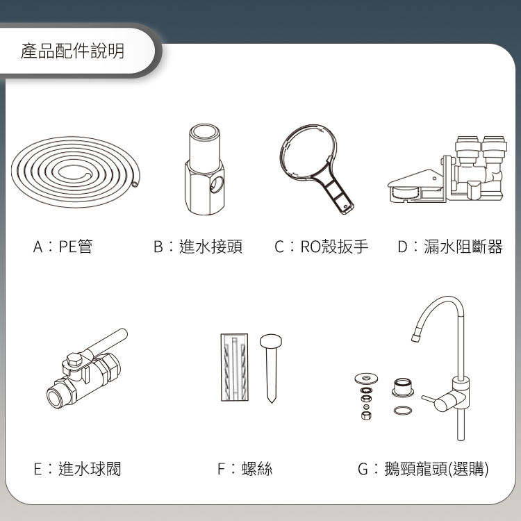 配件內容:3分PE管、2分PE管、RO把手x1、螺絲x2、壁虎x2、濾水器轉接頭x1、2分球塞接頭x1、漏水斷路器x1◆注意事項 ◎本產品僅送至一樓,恕不含安裝及舊品回收處理。 ◎本產品屬DIY組裝產品,或自行請專業水電進行安裝。