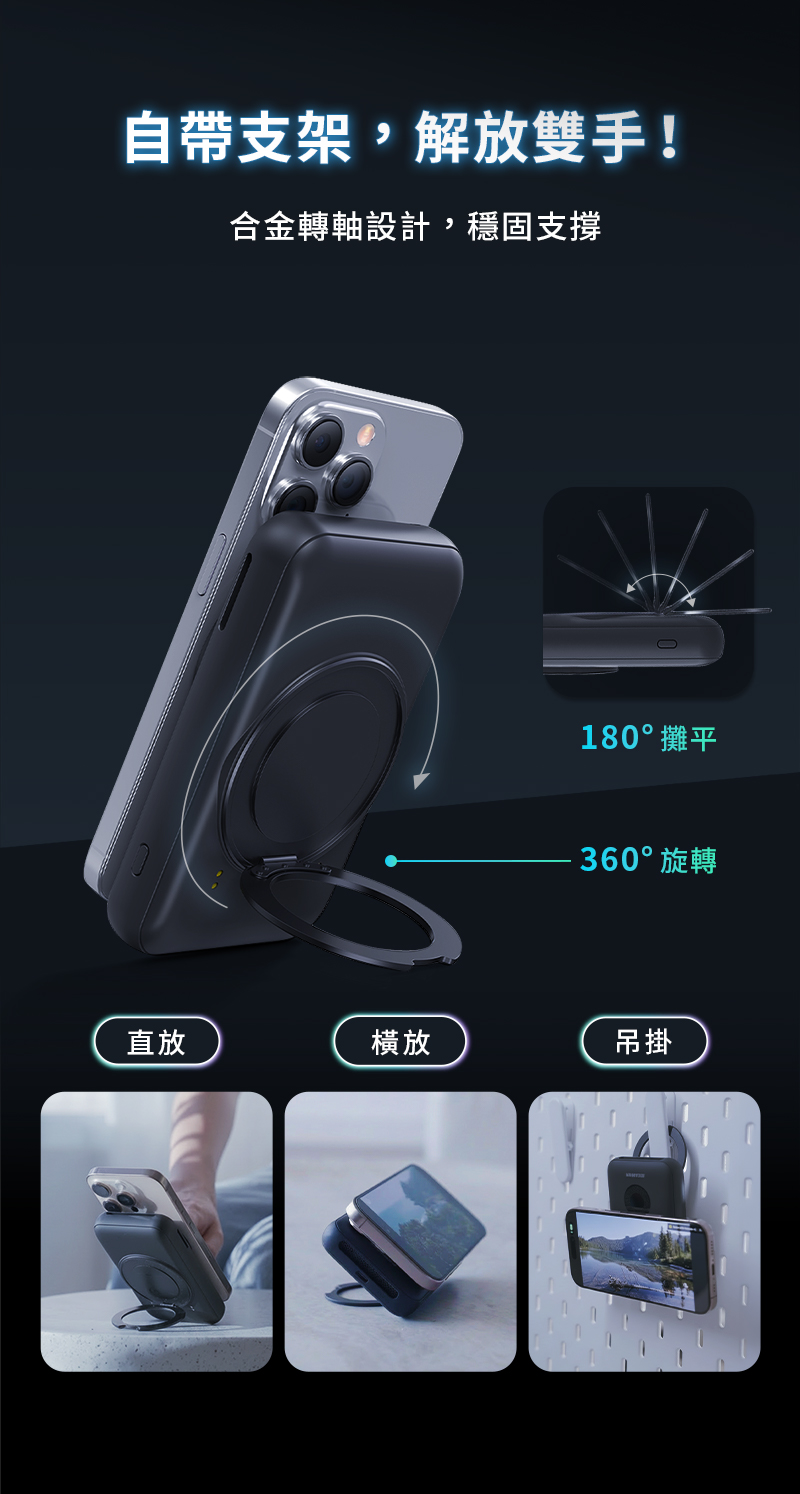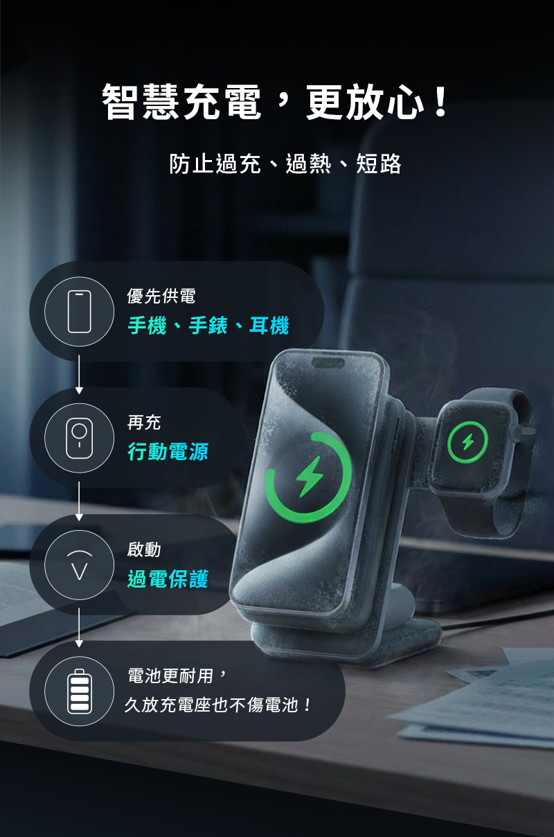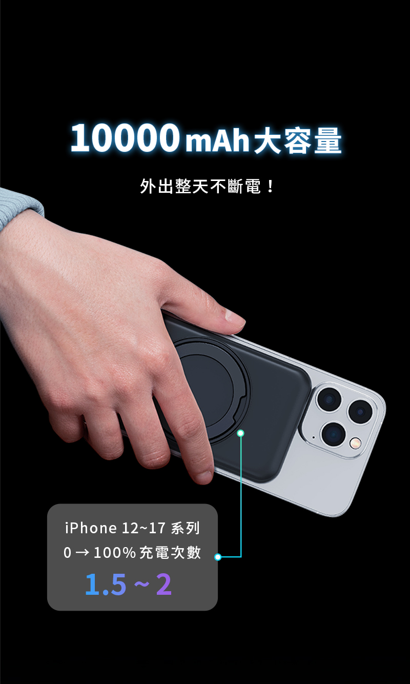 .「充電座X行動電源」一機雙充模式.首創「18℃低溫快充」主動降溫模組,充比不充還涼.Qi2 提供iPhone、Android手機高效快充.支援「三星手錶、蘋果手錶」充電.同時為 行動電源/手機/耳機/手錶 充電.自帶10000mAh/38.5Wh 大容量行動電源.支援無線、有線充電.商品有標註WH規格,可攜帶登機.充電座折疊式設計,方便旅行收納