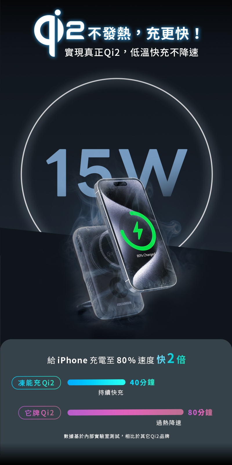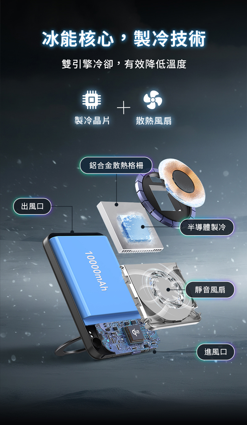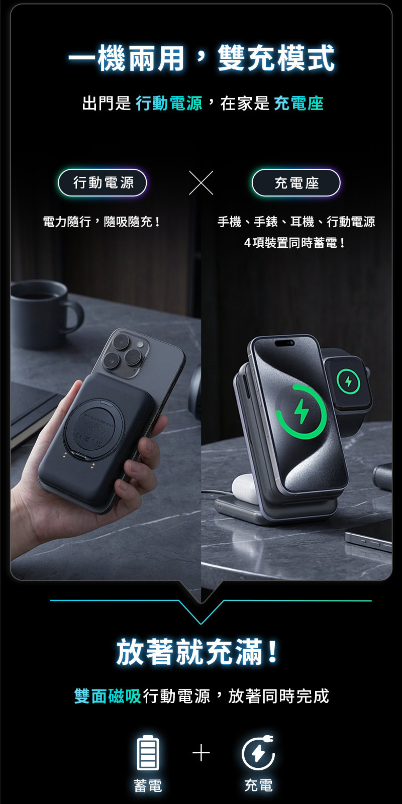.「充電座X行動電源」一機雙充模式.首創「18℃低溫快充」主動降溫模組,充比不充還涼.Qi2 提供iPhone、Android手機高效快充.支援「三星手錶、蘋果手錶」充電.同時為 行動電源/手機/耳機/手錶 充電.自帶10000mAh/38.5Wh 大容量行動電源.支援無線、有線充電.商品有標註WH規格,可攜帶登機.充電座折疊式設計,方便旅行收納