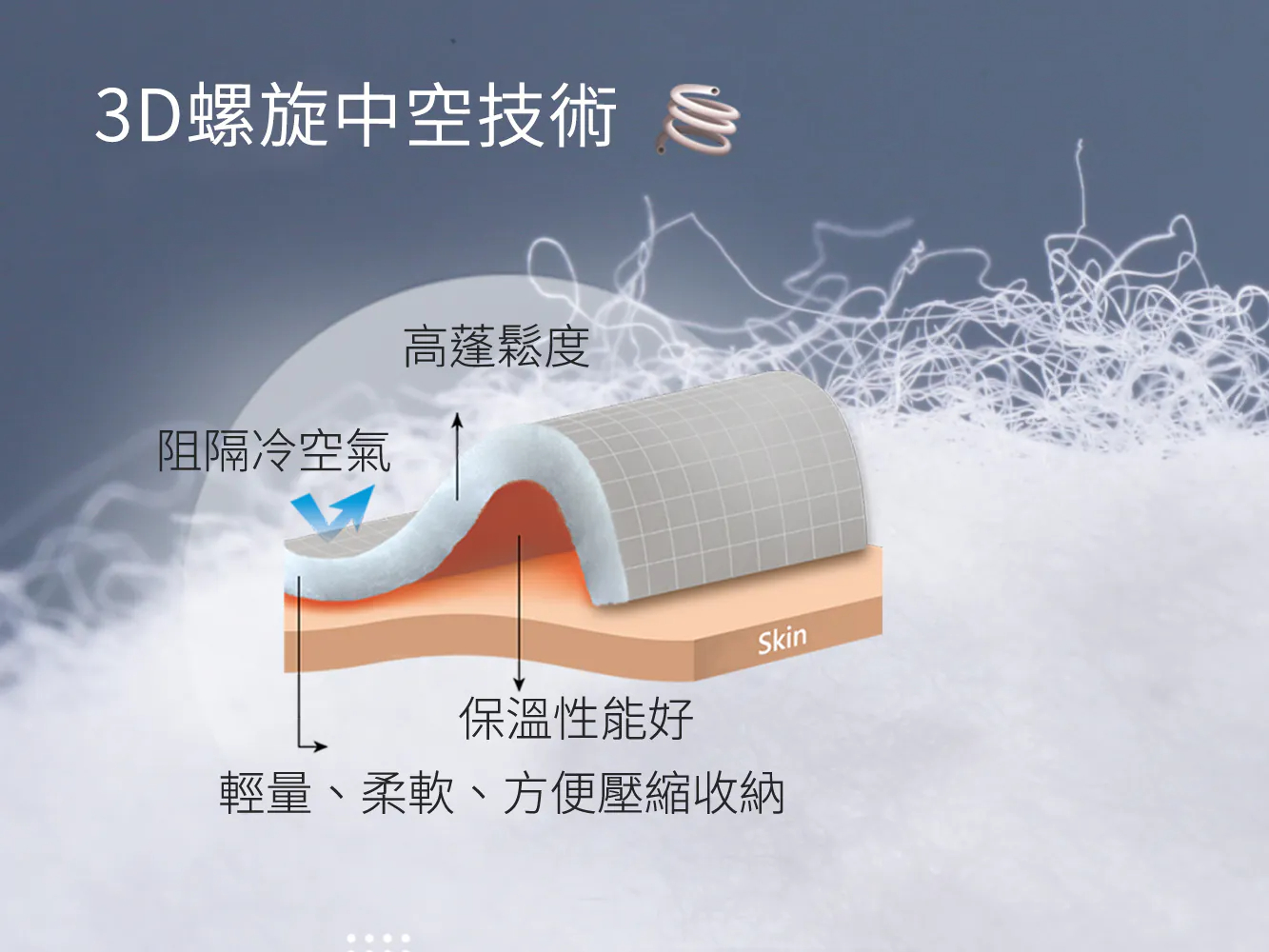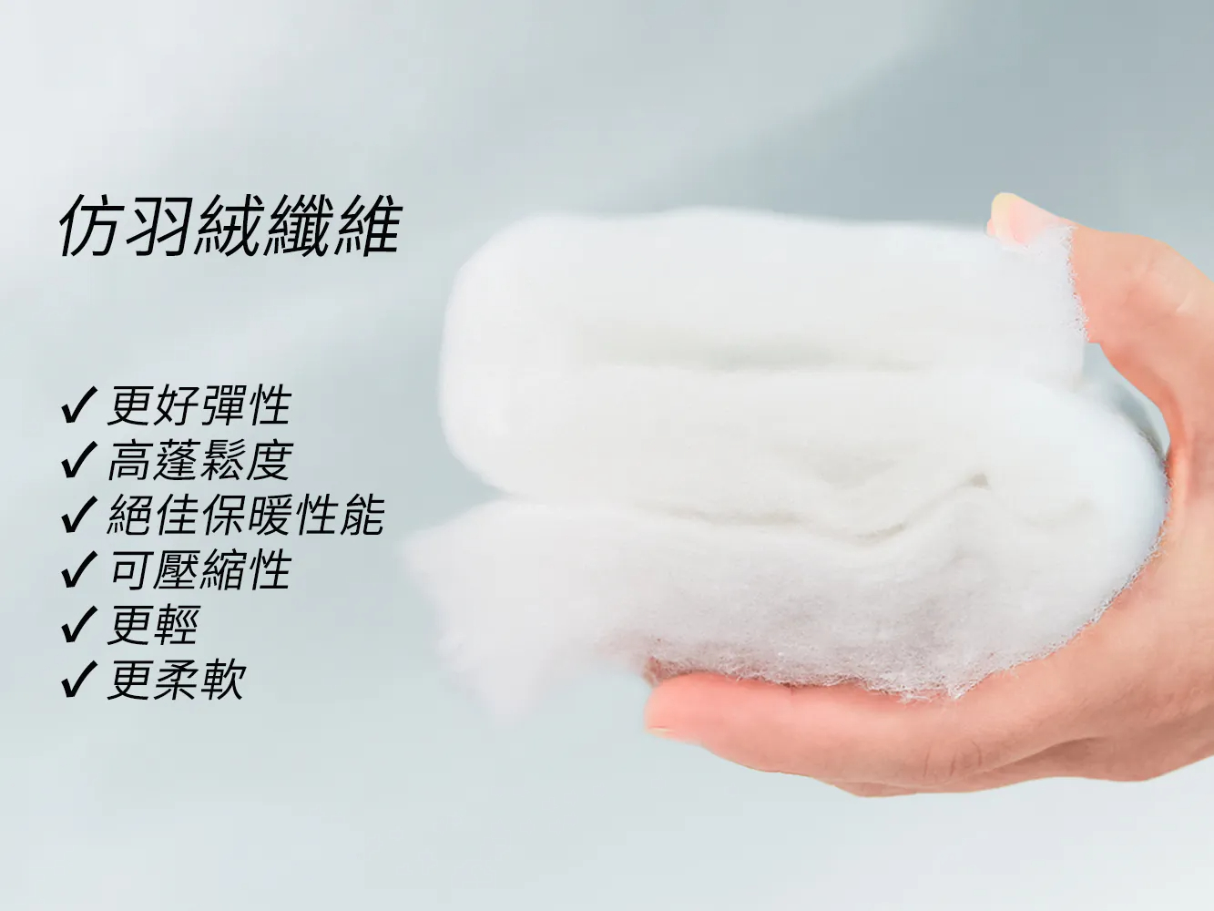 【填充物】FENC® Insulate 仿羽絨纖維利用仿生學,模仿羽絨結構,設三維螺旋狀超細短纖維。