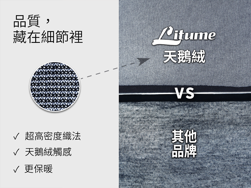 特選布料:使用台灣高品質天鵝絨,具有良好的親膚性。經過布面刷毛處理,能有效提升保暖效果。