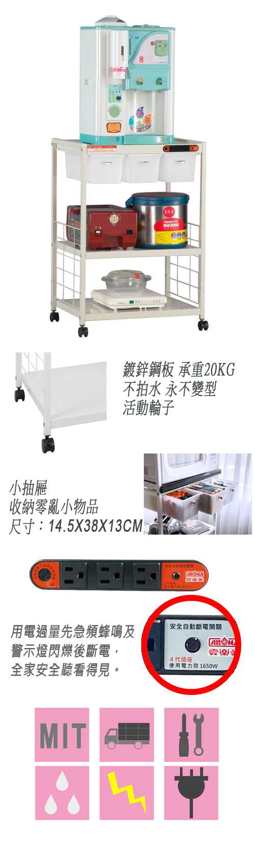用電過量先蜂鳴後斷電全家安全聽看得見可水洗、不怕蒸氣、永不變形拉板抽拉方便好整理每層可承戴20KG材質:鍍鋅鋼板外覆粉體烤漆產地:台灣電壓:110V