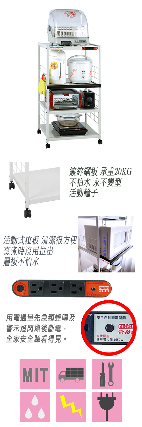 用電過量先蜂鳴後斷電全家安全聽看得見可水洗、不怕蒸氣、永不變形拉板抽拉方便好整理每層可承戴20KG材質:鍍鋅鋼板外覆粉體烤漆產地:台灣電壓:110V