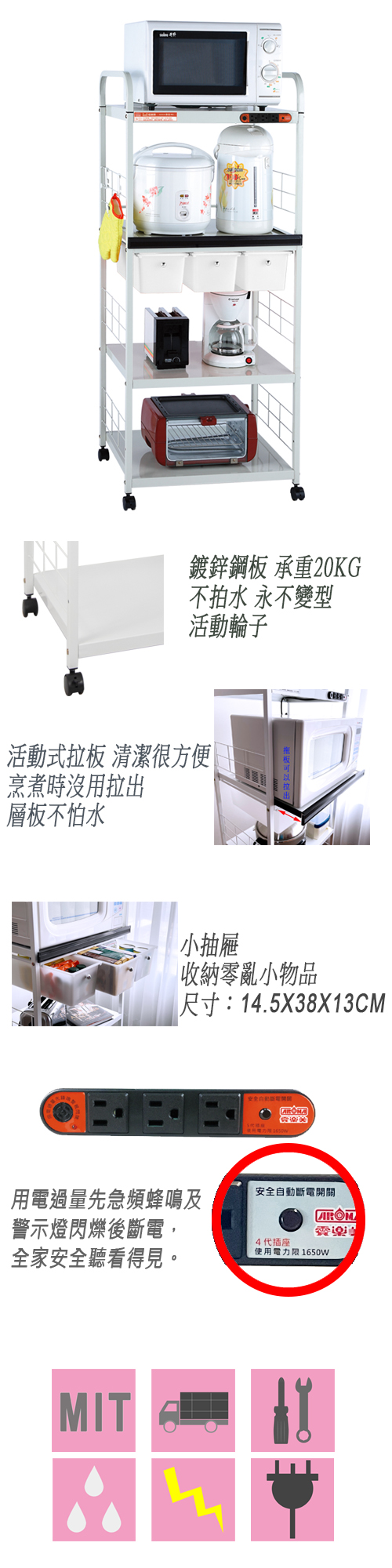 用電過量先蜂鳴後斷電全家安全聽看得見可水洗、不怕蒸氣、永不變形拉板抽拉方便好整理每層可承戴20KG材質:鍍鋅鋼板外覆粉體烤漆產地:台灣電壓:110V