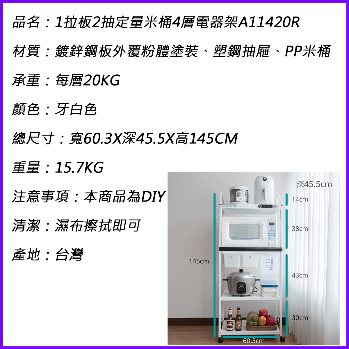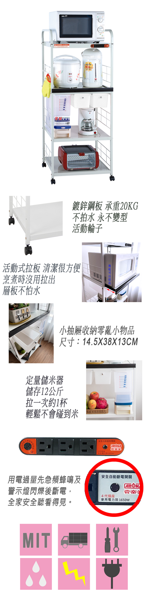 用電過量先蜂鳴後斷電 全家安全聽看得見 可水洗、不怕蒸氣、永不變形 拉板抽拉方便好整理 每層可承戴20KG 材質:鍍鋅鋼板外覆粉體烤漆 產地:台灣 電壓:110V