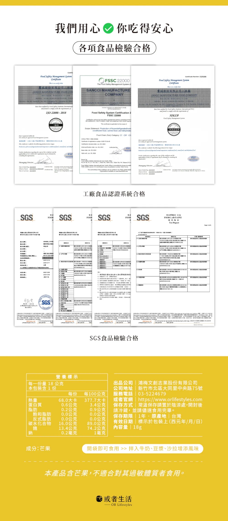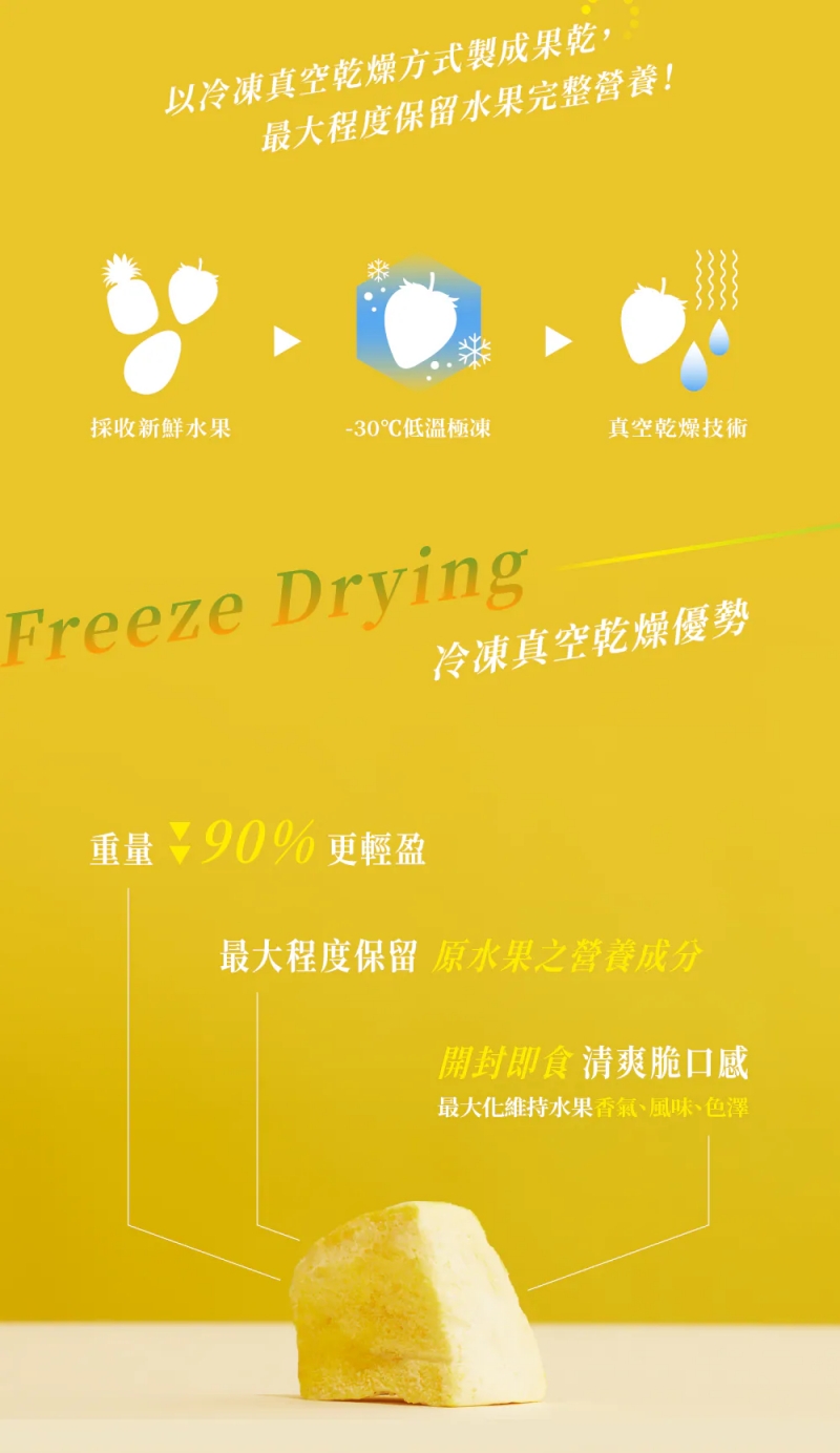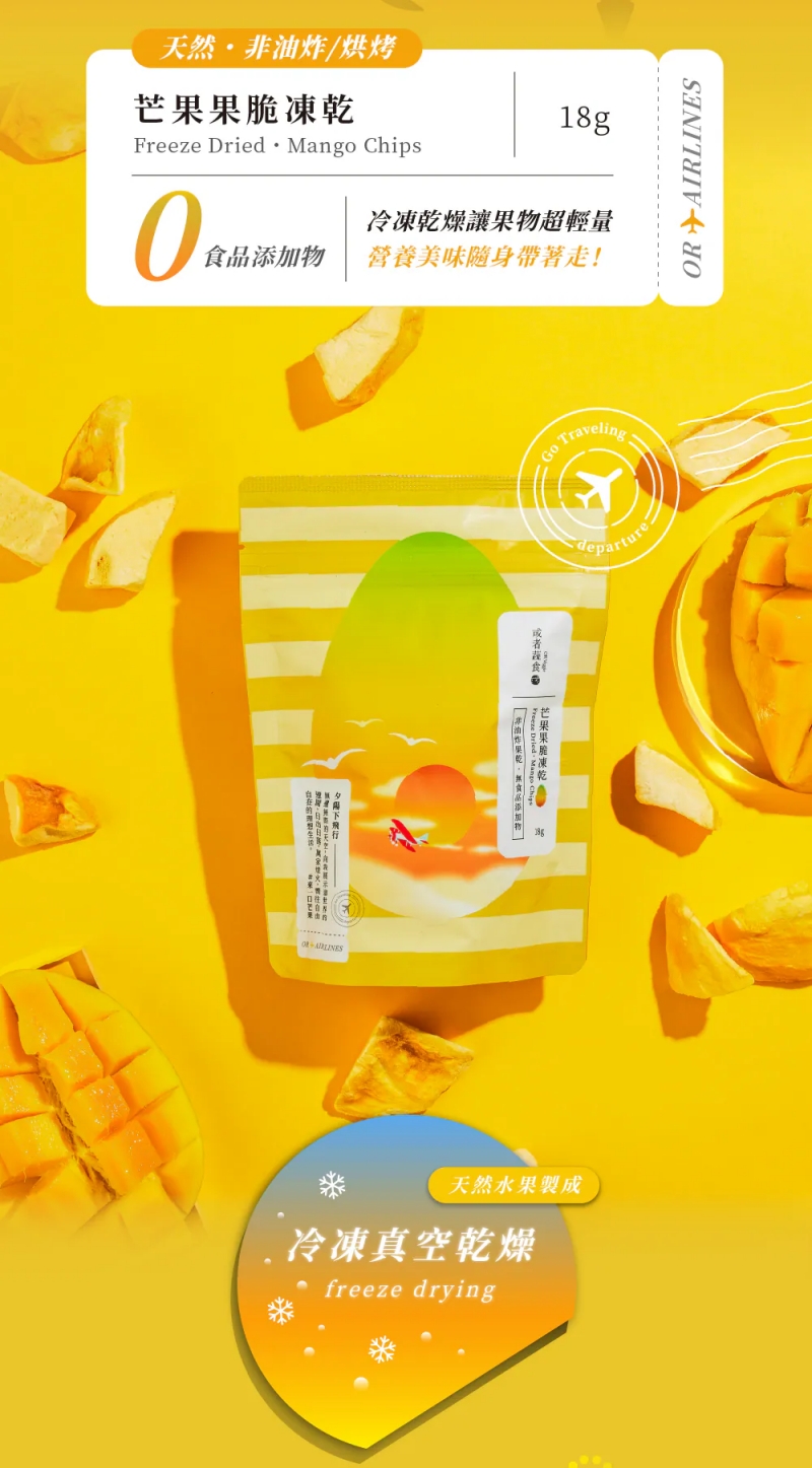 🏅榮獲「2024食創獎」年度十大美味新品以「-30°冷凍」與「真空乾燥技術」,去除水果中水分,最大程度保留水果天然纖維、香氣及口感,封存滿滿營養成分!乾燥技術同時讓果物超輕量,果乾口感酥脆,入口即化,營養美味方便隨身帶著走!●規格:18g ●成分:芒果●保存期限:一年●保存方式:請保存於室溫陰涼處並避免陽光直射,開封後請密封保存並盡速食用完畢。●原產地:台灣