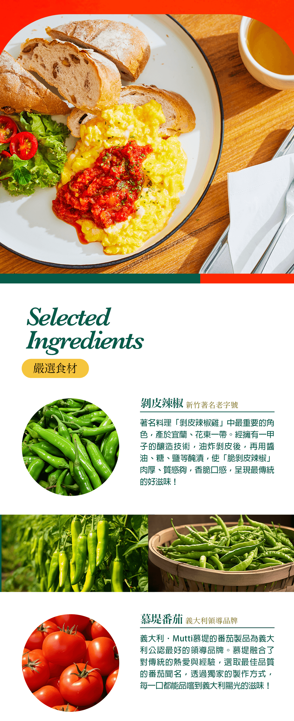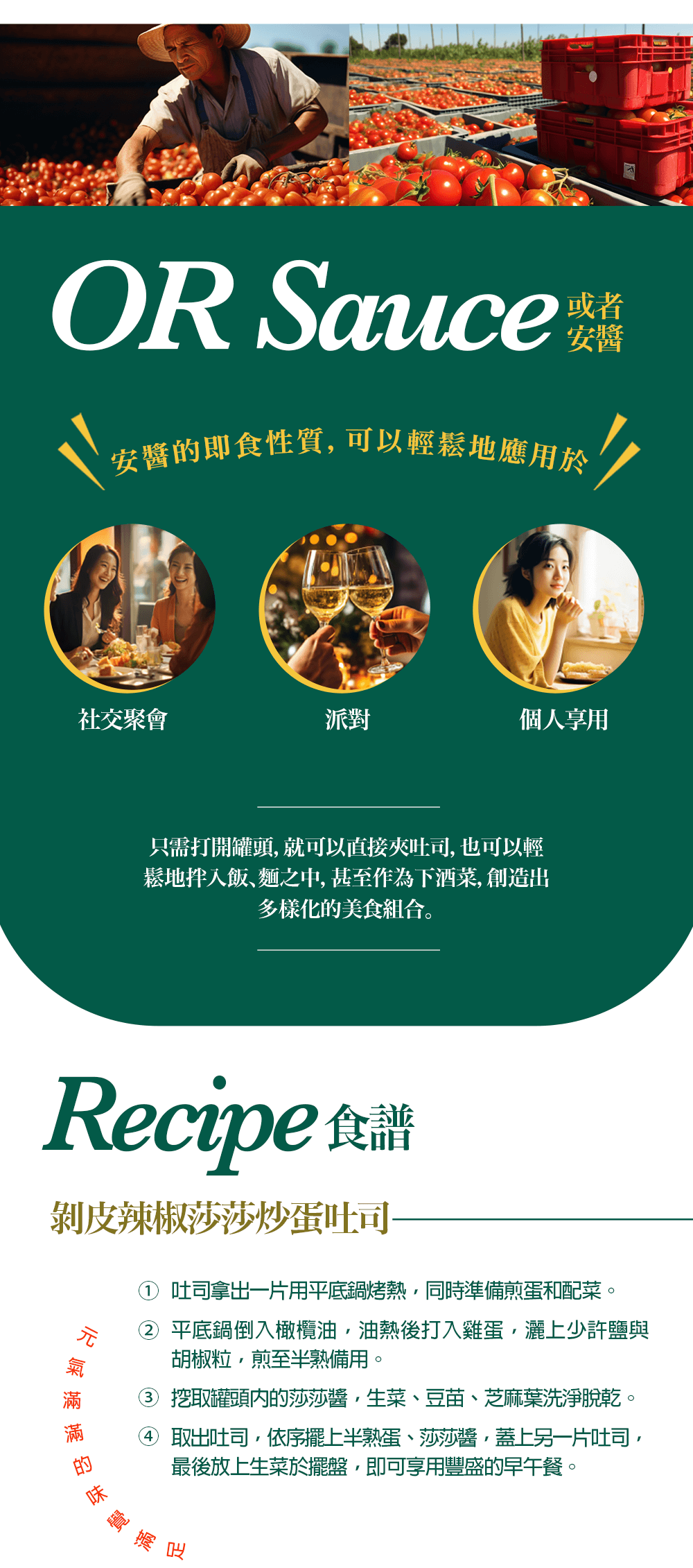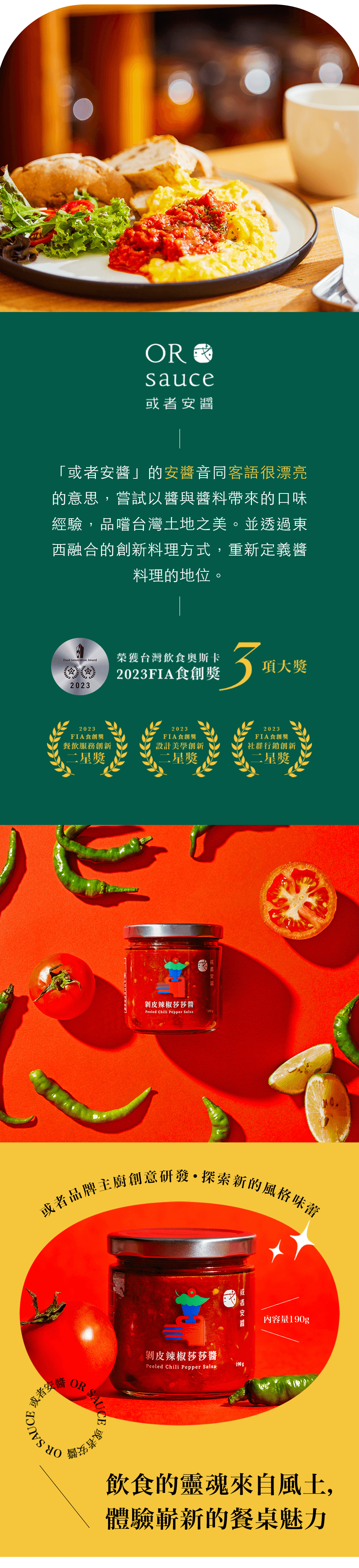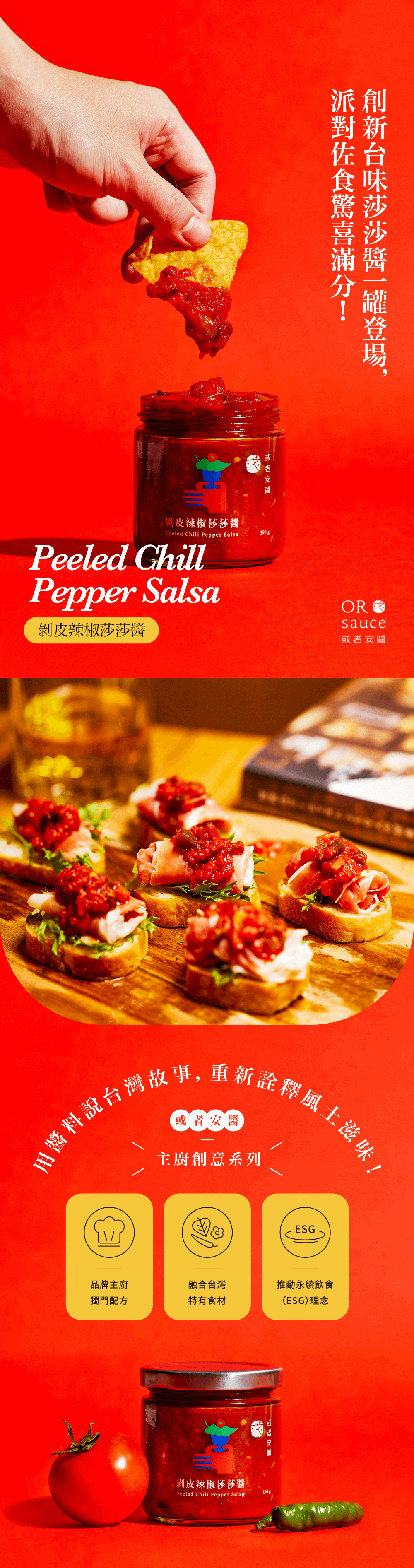 或者品牌主廚創意研發,將西方莎莎醬中的性格辣感與新鮮脆感,以剝皮辣椒取代,獨特的鮮味提供更富饒的味覺感受!開罐即可食用,輕鬆地沾醬或佐餐應用,不論在社交聚會、派對或個人享用,都能創造充滿趣味的美食體驗。●辣度:微微辣🌶●規格:190g ●特色食材:慕堤蕃茄、台式剝皮辣椒●保存期限:2年●保存方式:未開封請常溫保存,避免高溫潮濕及日曬場所;開封後冷藏,並儘速食用完畢。●原產地:台灣