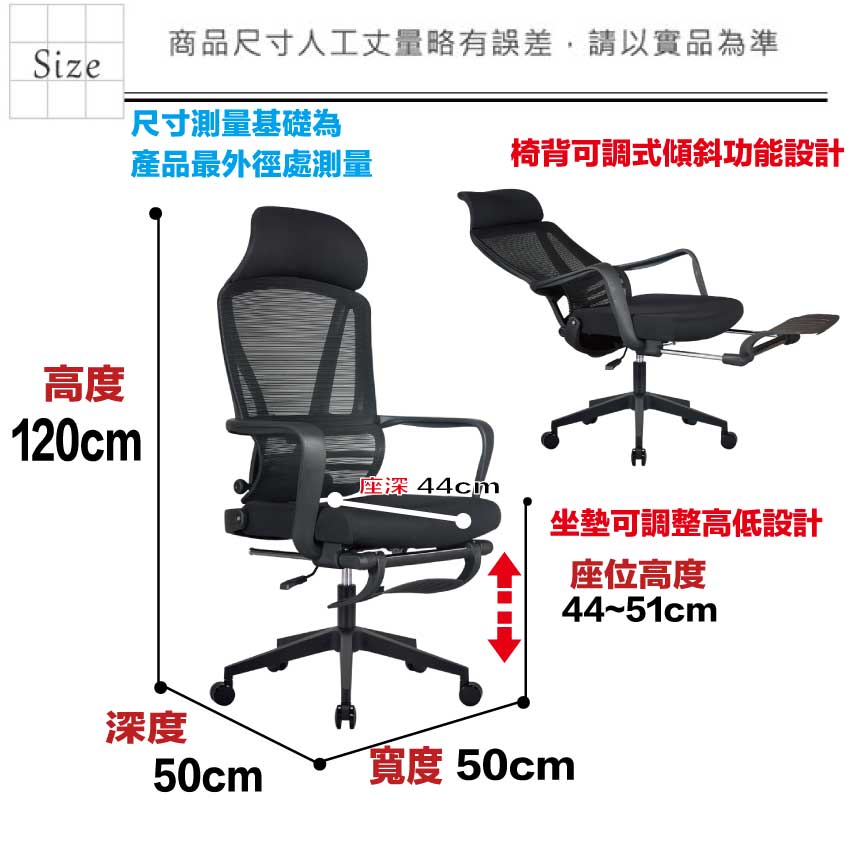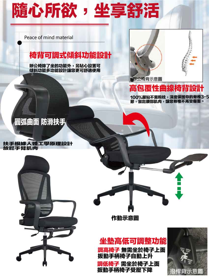 辦公椅搭配採用椅背可後仰&坐墊高度調整+連動式伸縮腳靠枕等機能性設計