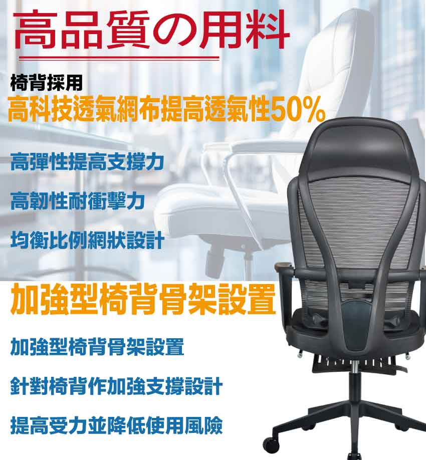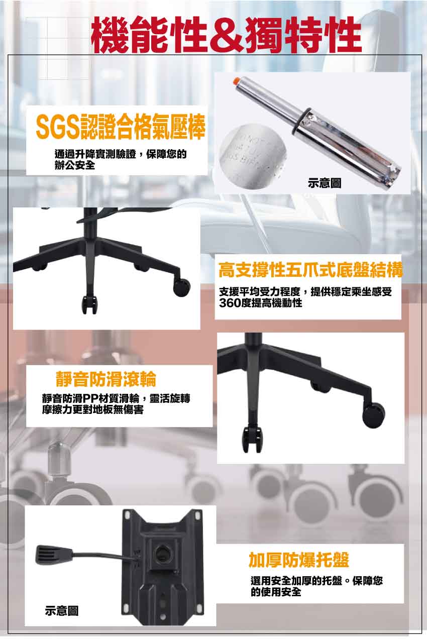 採用高剛性PP材質+高透氣強韌網布+五抓式底盤+防爆托盤架+高磅數氣壓棒+靜音防滑滾輪+高回彈性加厚泡棉等安心材質製造