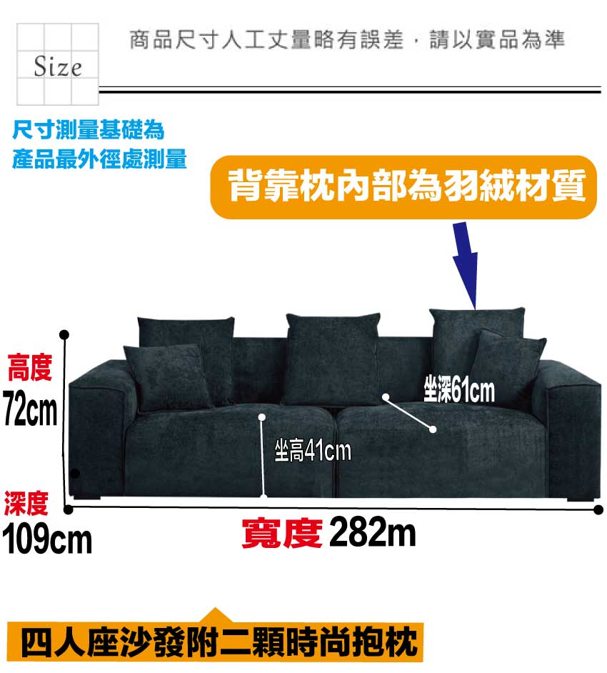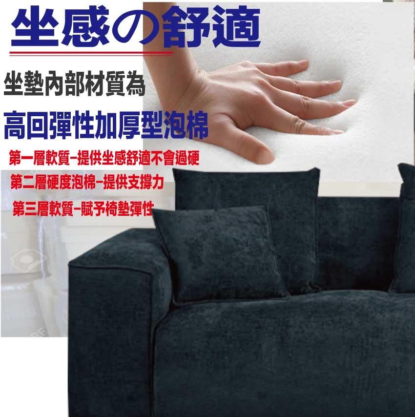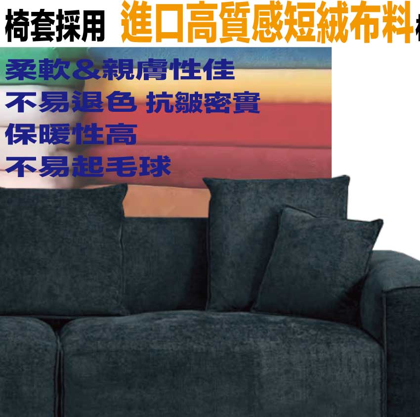 採用內部實木板材框架+防潮造型腳座+進口短絨布料+高回彈力加厚泡棉等安心材質製造