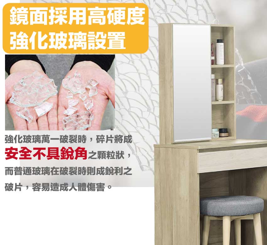採用防蛀木心板+防潮耐磨底座+五金滑軌結構+強化玻璃鏡面等安心材質製造