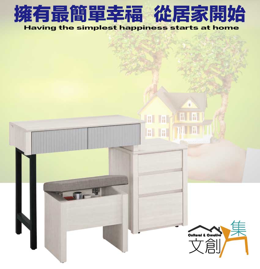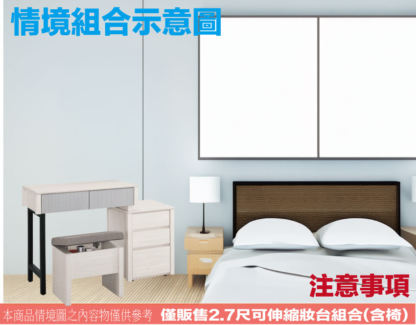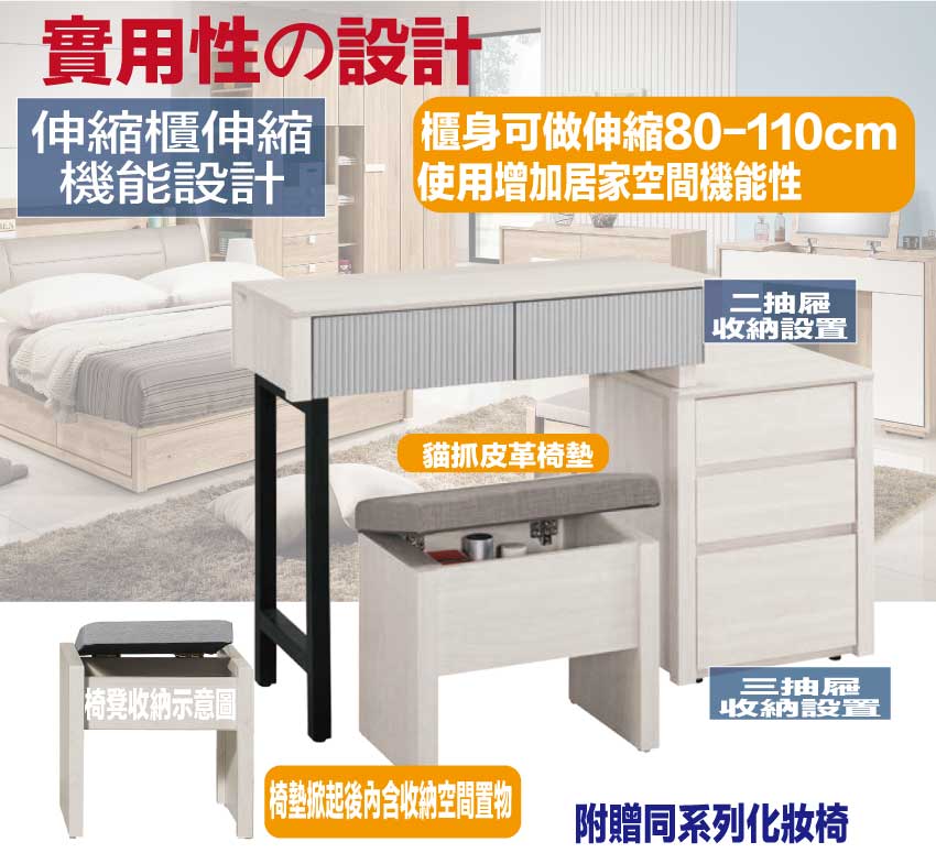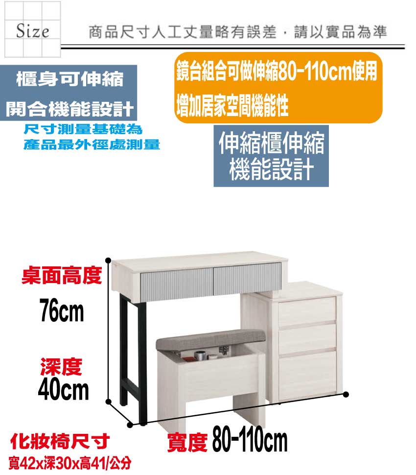 鏡台櫃身寬度可調整80-110cm使用搭配可掀蓋收納化妝椅凳,滿足您居家空間使用便利性