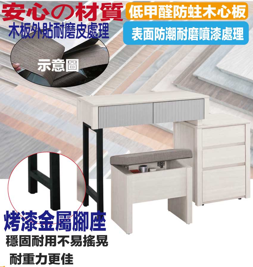 採用防蛀木心板+五金滑軌結構+烤漆金屬腳座等安心材質製造