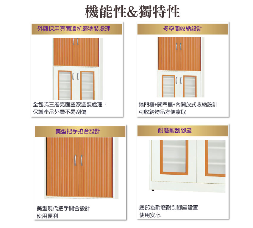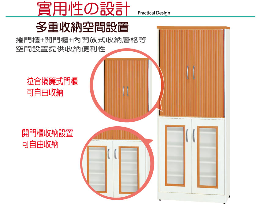 捲簾拉門櫃+雙開門+內開放式層格等便利收納空間設計