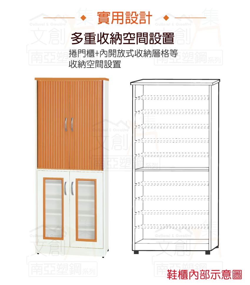【文創集】瓦多 環保2.4尺南亞塑鋼捲簾推門&雙開門高鞋櫃 產品採用第一品牌-台製南亞塑鋼舒美板+五金滑軌結構材質,整體材質採用防水+防燃+無甲醛安心塑鋼材質製造 ,搭配捲簾拉門櫃+雙開門+內開放式層格等便利收納空間設計,防止受潮,增加支撐力,堅固不會塌陷,全由專人配送到家,專業安心服務,替你省下更多時間!