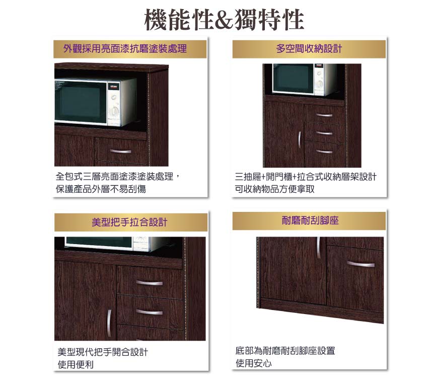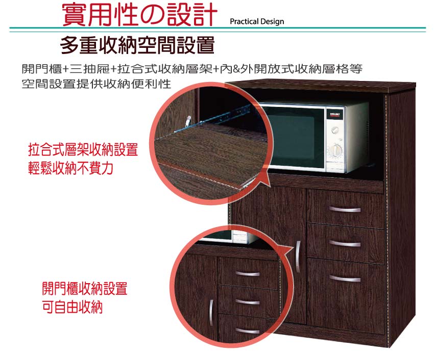 開門櫃+三抽屜+內&外開放式層格+拉合式層架等便利收納空間設計