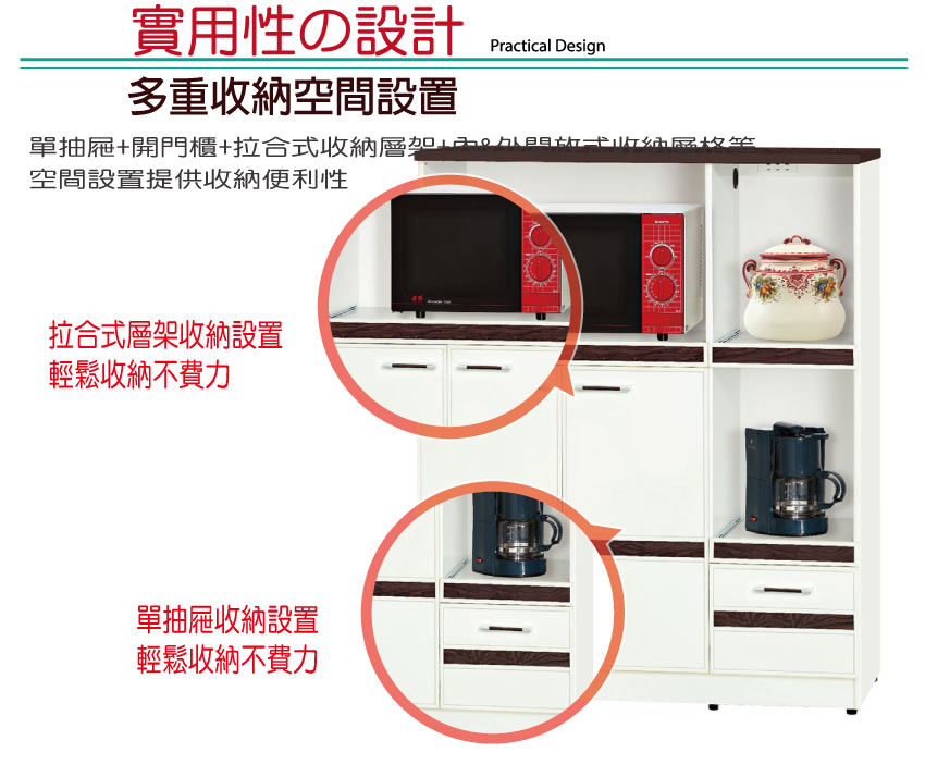 開門櫃+單抽屜+內&外開放式層格+拉合式層架等便利收納空間設計