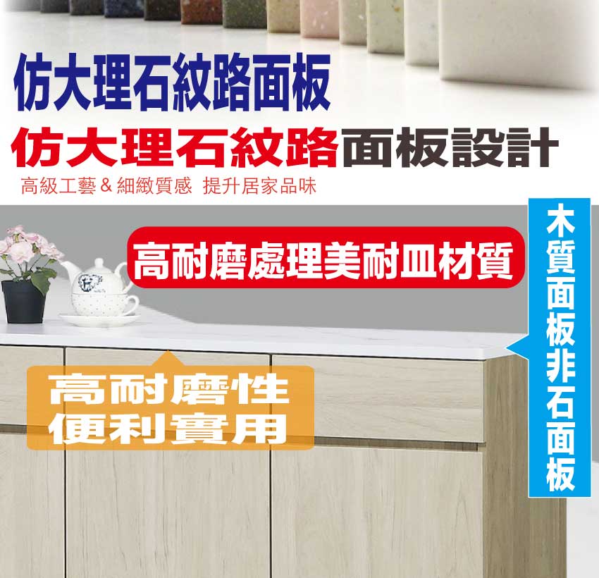 防蛀木心板+防潮耐磨底座+五金滑軌結構+仿大理石紋美耐皿耐磨材質桌面板+防夾手緩衝門片五金等材質