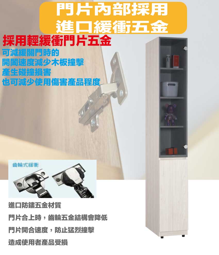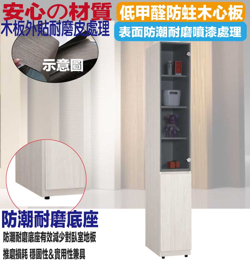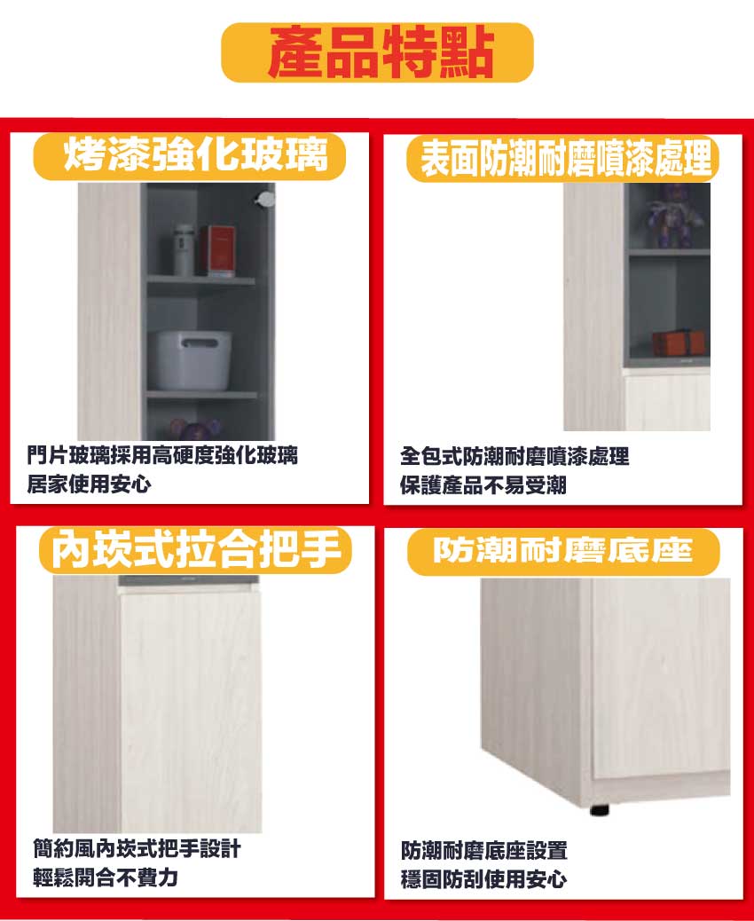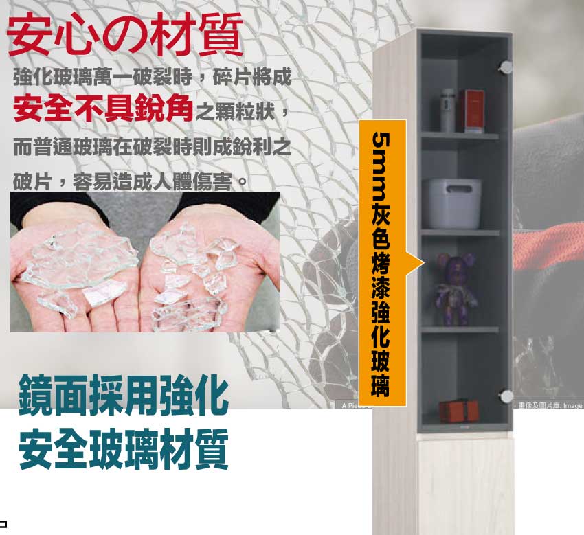 材質:防蛀木心板+防潮耐磨腳座+防夾手緩衝門片五金+5mm強化灰玻璃