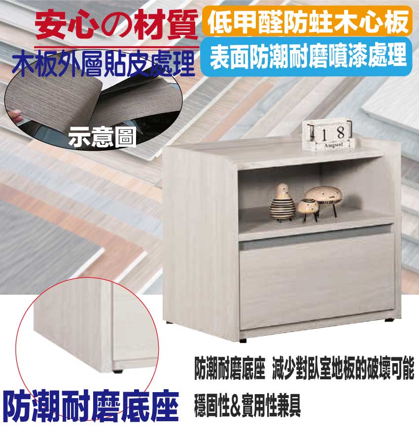 【文創集】華爾1.5尺單抽開放床頭櫃 木紋雙色系+安心材質製造,使用放心+搭配居家更便利,採用防蛀木心板+防潮耐磨底座+五金滑軌結構等安心材質製造 ,外層採用防潮耐磨噴漆處理搭配採用單抽屜+開放層格等收納空間設計,全由專人配送到家,專業安心服務,替你省下更多時間!