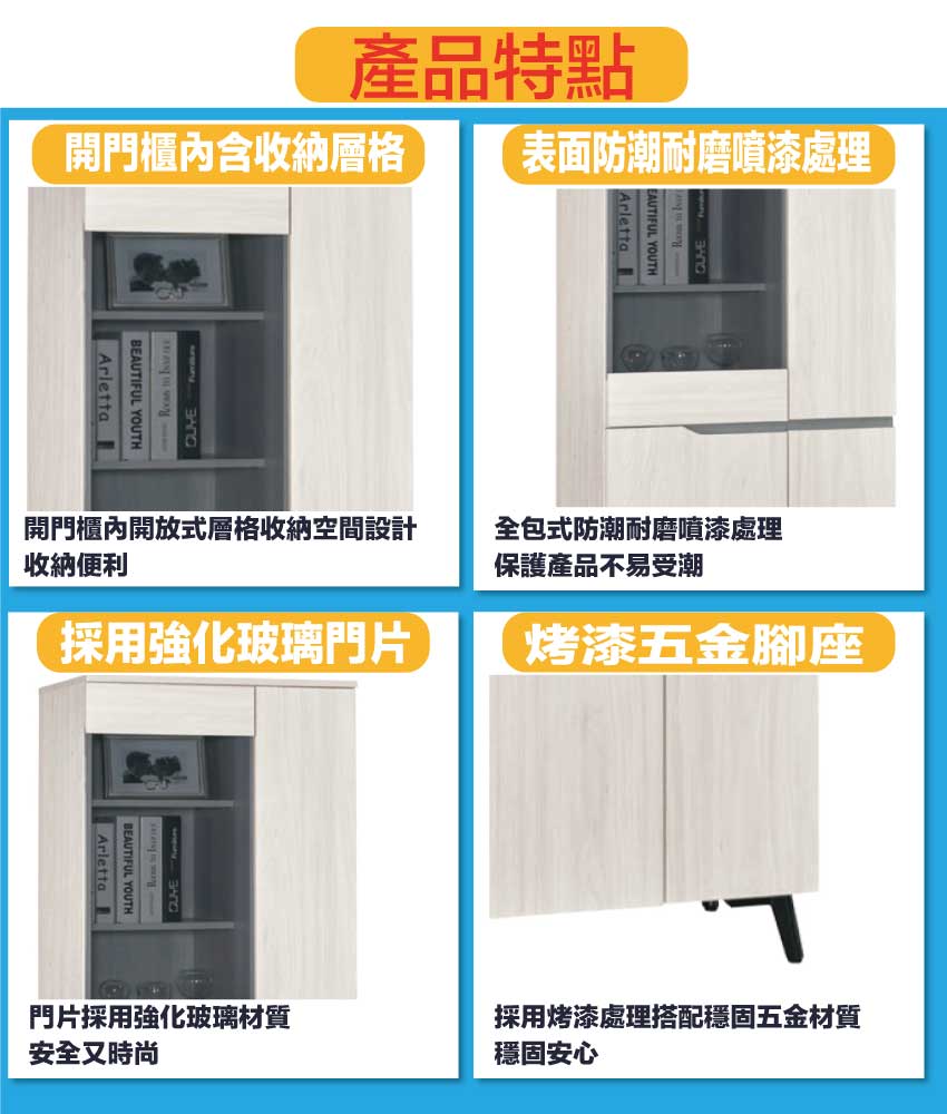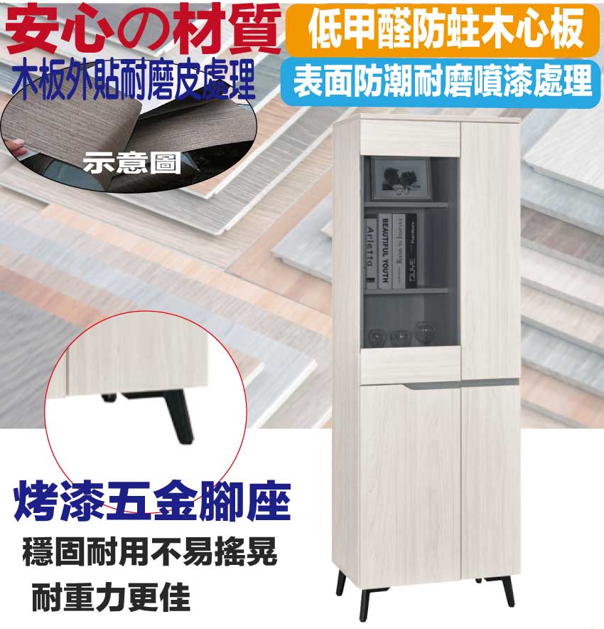 【文創集】丹尼2尺灰玻四門高展示櫃 木紋雙色系+安心材質製造,使用放心+搭配居家更便利,採用防蛀木心板+烤漆五金腳座+防夾手緩衝門片五金+5mm強化灰玻璃等安心材質製造 ,外層採用防潮耐磨噴漆處理搭配採用開門櫃+內開放層格等收納空間設計,全由專人配送到家,專業安心服務,替你省下更多時間!