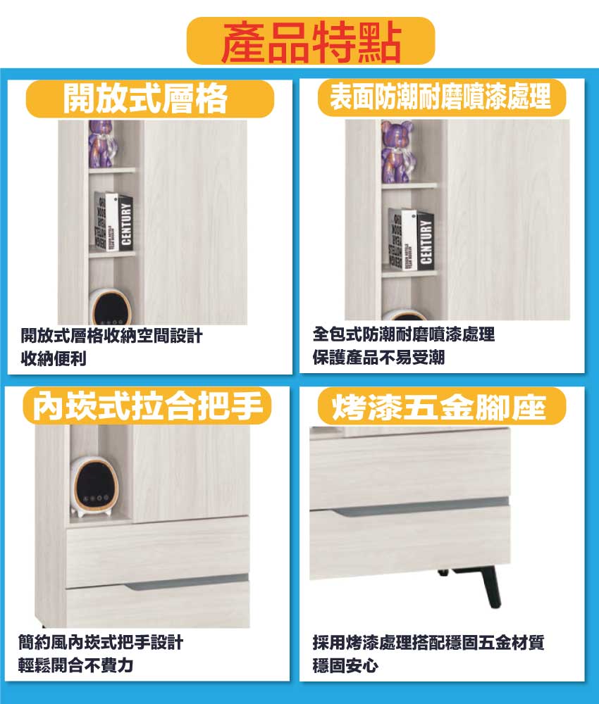搭配採用開門櫃+二抽屜+內&外開放層格等收納空間設計