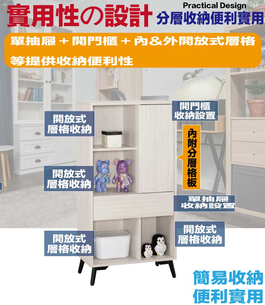搭配採用開門櫃+單抽屜+內&外開放層格等收納空間設計