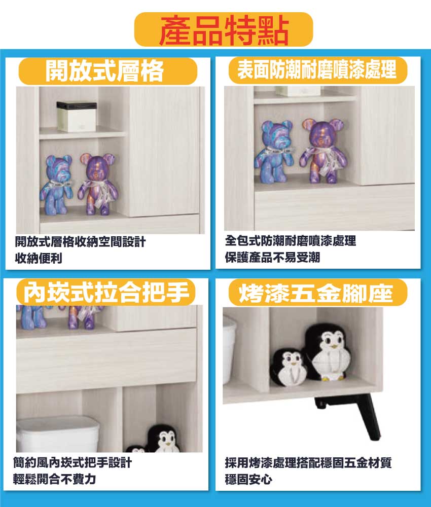 材質:防蛀木心板+烤漆五金腳座+防夾手緩衝門片五金+五金滑軌結構