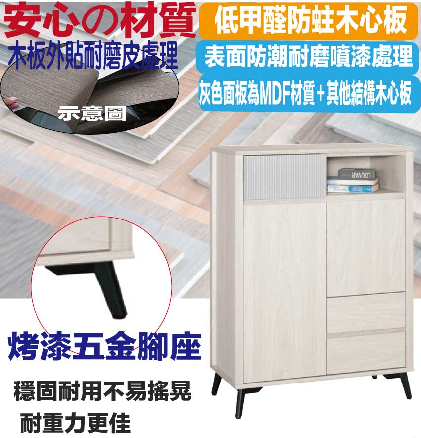 材質:防蛀木心板+防潮MDF板材(灰色耐磨面板)+烤漆五金腳座+防夾手緩衝門片五金+五金滑軌結構