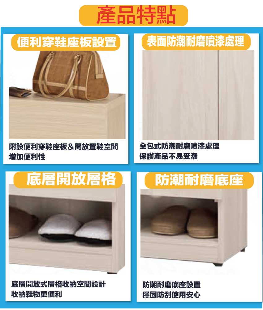 【文創集】朵利2尺單抽座鞋櫃(二色可選) 二色可選+安心材質製造,使用放心+搭配居家更便利,採用防蛀木心板+防潮耐磨底座等安心材質製造 ,外層採用防潮耐磨噴漆處理搭配採用穿鞋座板設置+單抽屜+開放層格等收納空間設計,全由專人配送到家,專業安心服務,替你省下更多時間!