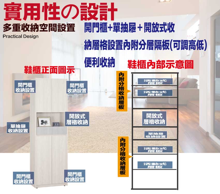 搭配採用開門櫃+單抽屜+內&外開放層格等收納空間設計