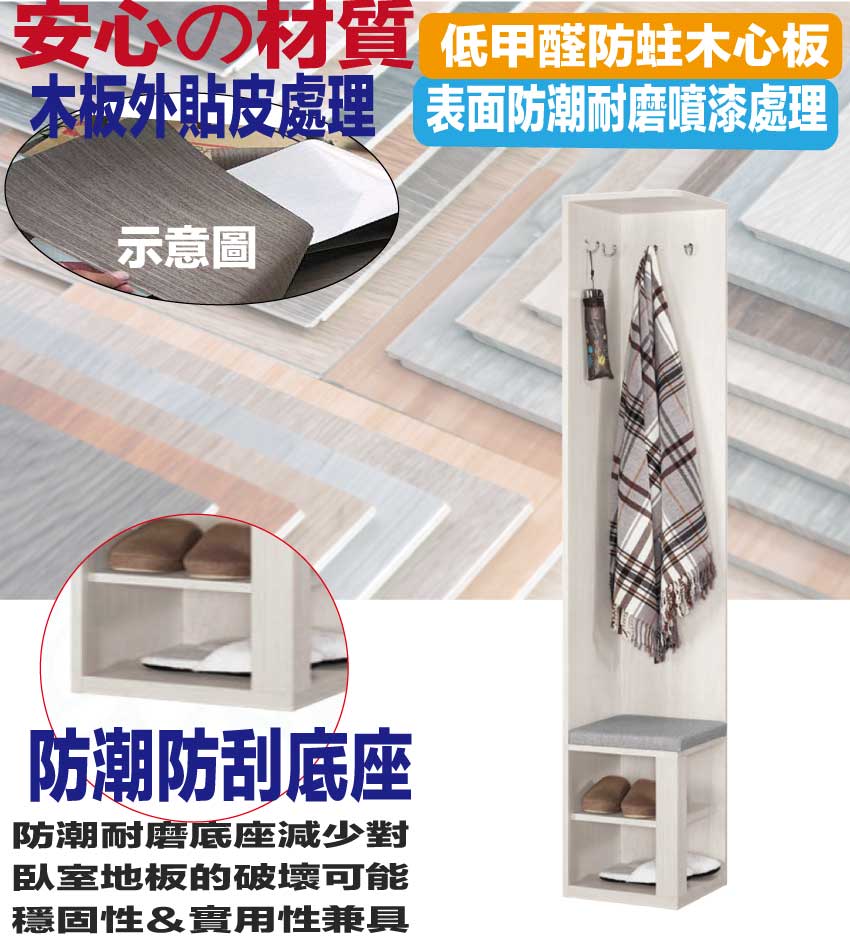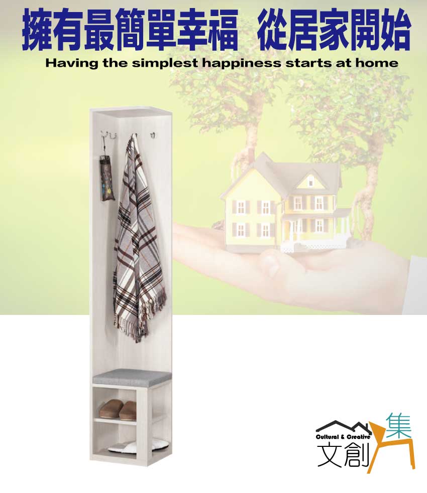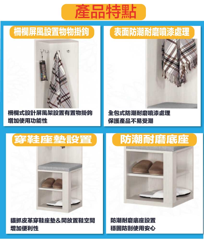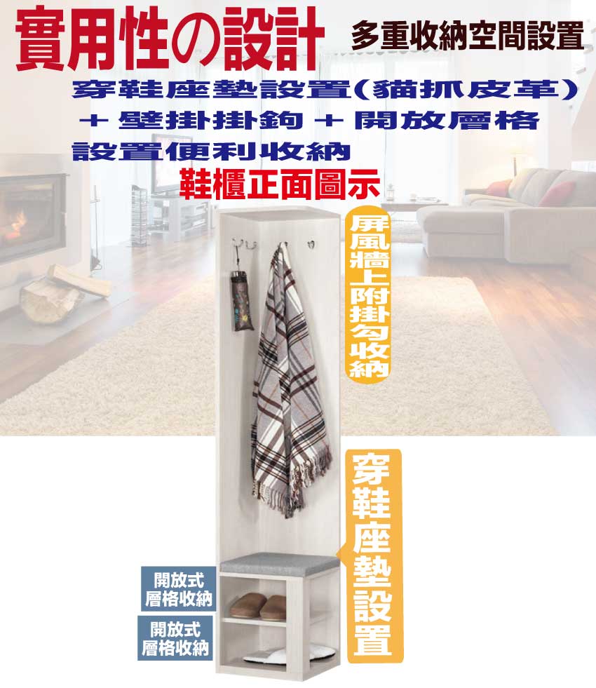 【文創集】丹尼雙色1.1尺開放式玄關座鞋櫃 木紋雙色系+安心材質製造,使用放心+搭配居家更便利,採用防蛀木心板+防潮耐磨底座+貓抓皮革坐墊等安心材質製造 ,外層採用防潮耐磨噴漆處理搭配採用開放層格+置物掛勾+穿鞋椅坐墊等收納空間設計,全由專人配送到家,專業安心服務,替你省下更多時間!