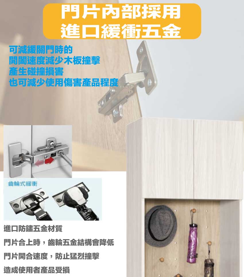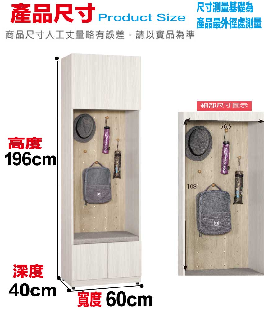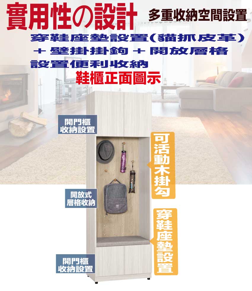 搭配採用開門櫃+開放層格+置物木棒掛勾(五隻可調整位置)+穿鞋椅坐墊設置等收納空間設計