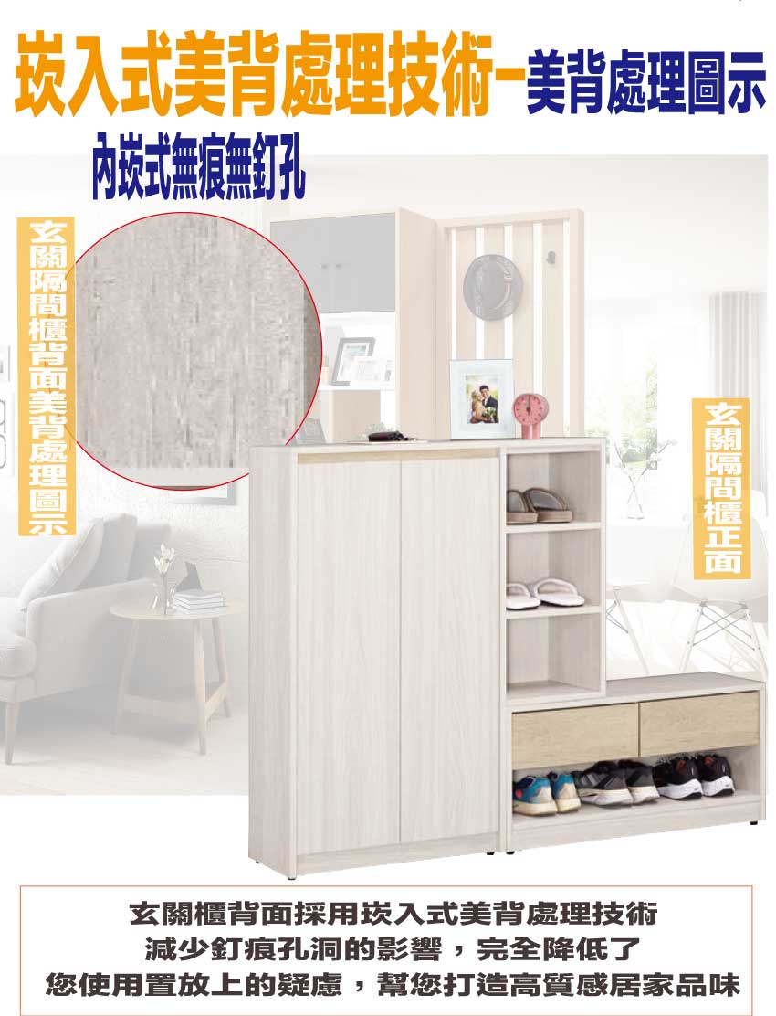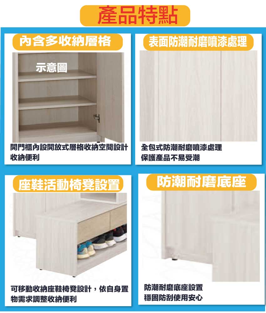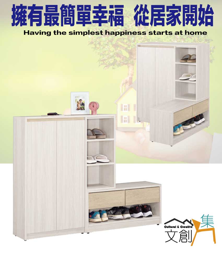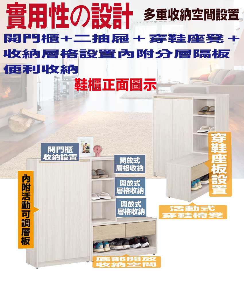 搭配採用開門櫃+二抽屜+內&外開放層格+座鞋櫃可活動擺設等收納空間設計