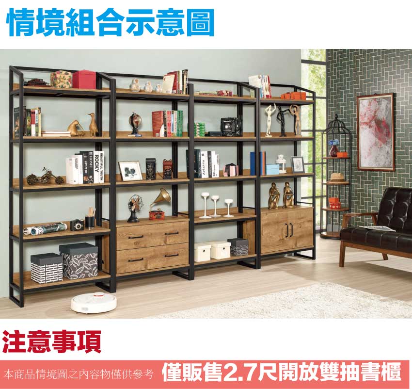 【文創集】華爾2.7尺開放二抽金屬邊框書櫃-黑漆雙色(客約商品)