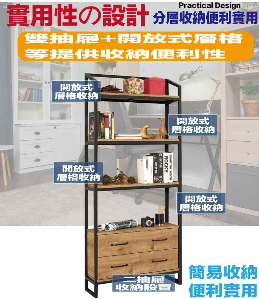 【文創集】華華爾2.7尺開放二抽金屬邊框書櫃(二色可選) 二色可選+安心材質製造,使用放心+搭配居家更便利,採用防蛀木心板+烤漆五金腳座+啞光銀金屬邊框等安心材質製造 ,外層採用防潮耐磨噴漆處理搭配採用二抽屜+開放層格等收納空間設計,全由專人配送到家,專業安心服務,替你省下更多時間!