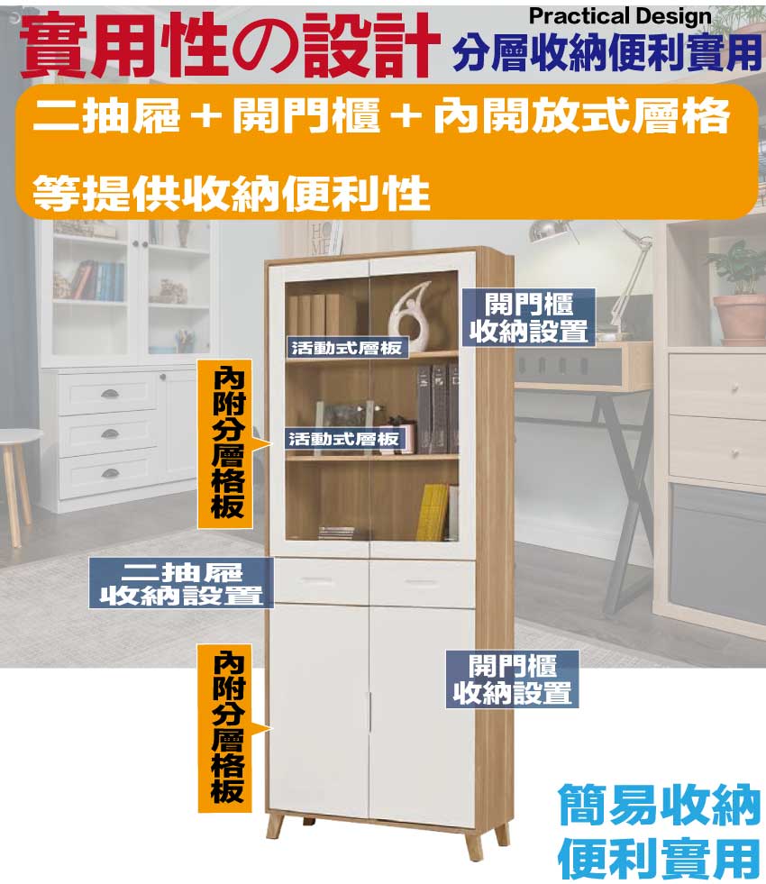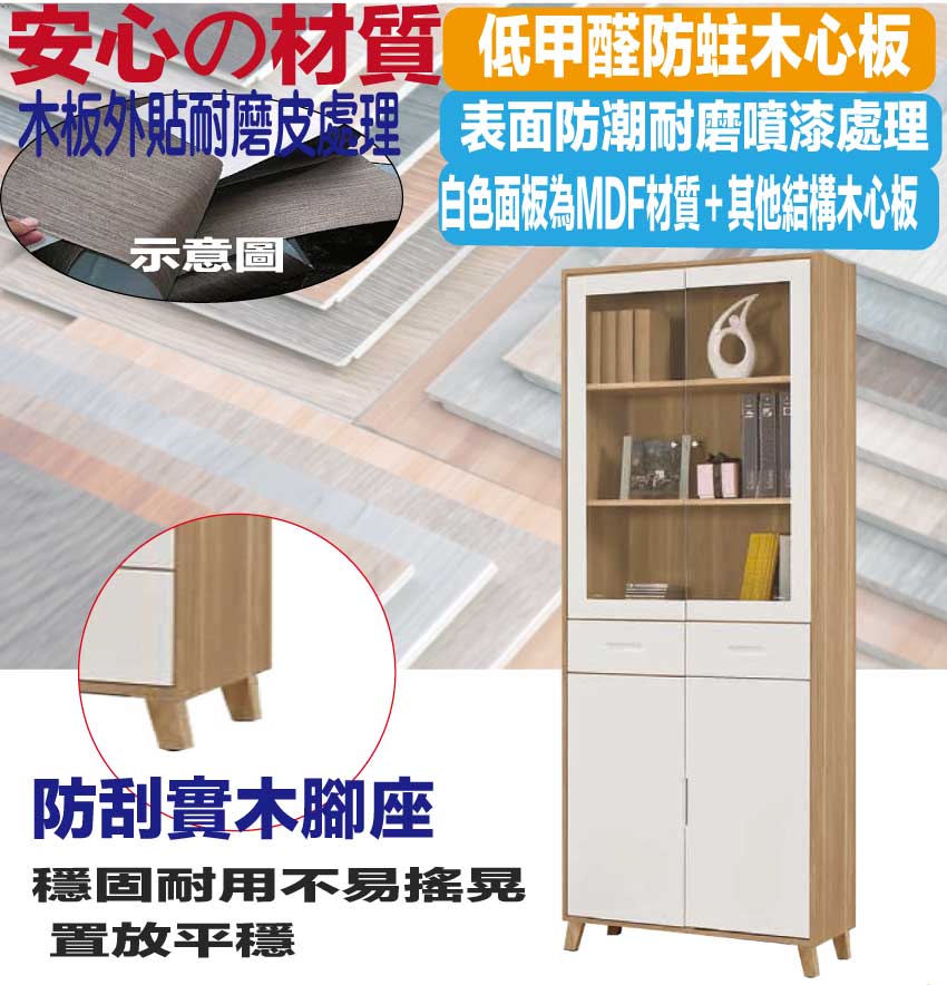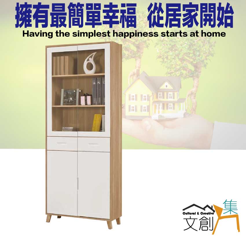 【文創集】卡蜜雙色2.7尺四門二抽書櫃 木紋雙色系+安心材質製造,使用放心+搭配居家更便利,採用防蛀木心板+防潮MDF板(白色面板)+防刮實木腳座+5mm強化玻璃等安心材質製造 ,外層採用防潮耐磨噴漆處理搭配採用開門櫃+二抽屜+內開放層格等收納空間設計,全由專人配送到家,專業安心服務,替你省下更多時間!