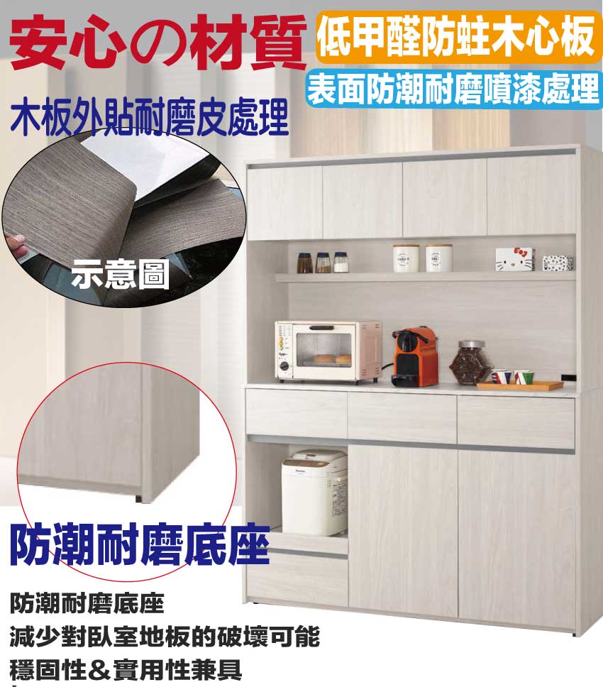 【文創集】華爾雙色4.5尺六門拉盤高餐櫃組合 木紋雙色系+安心材質製造,使用放心+搭配居家更便利,採用防蛀木心板+防潮耐磨底座+防夾手緩衝門片五金+仿石紋耐磨美耐皿桌面板+五金滑軌結構等安心材質製造 ,外層採用防潮耐磨噴漆處理搭配採用開門櫃+拉盤層架+三抽屜+內&外開放層格+便利插座等收納空間設計,全由專人配送到家,專業安心服務,替你省下更多時間!