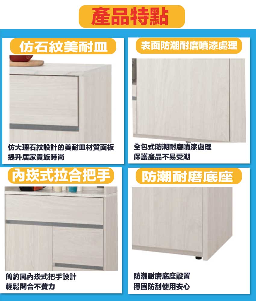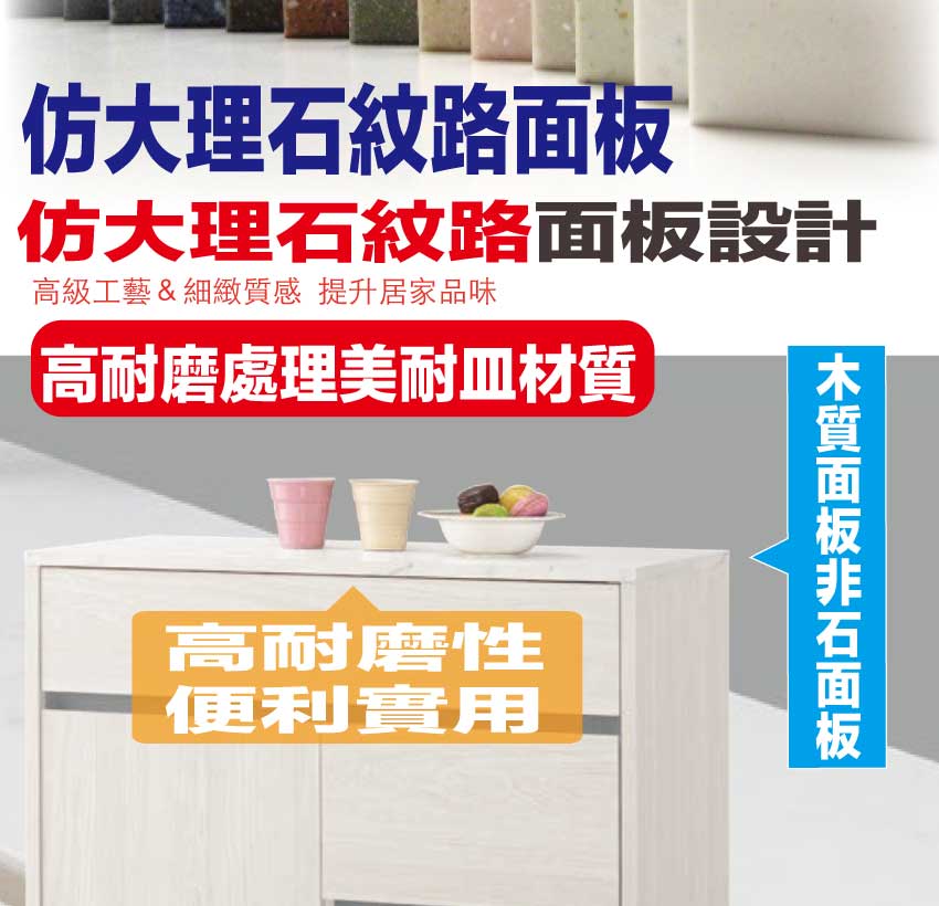 材質:防蛀木心板+防潮耐磨底座+防夾手緩衝門片五金+仿石紋耐磨美耐皿桌面板+五金滑軌結構