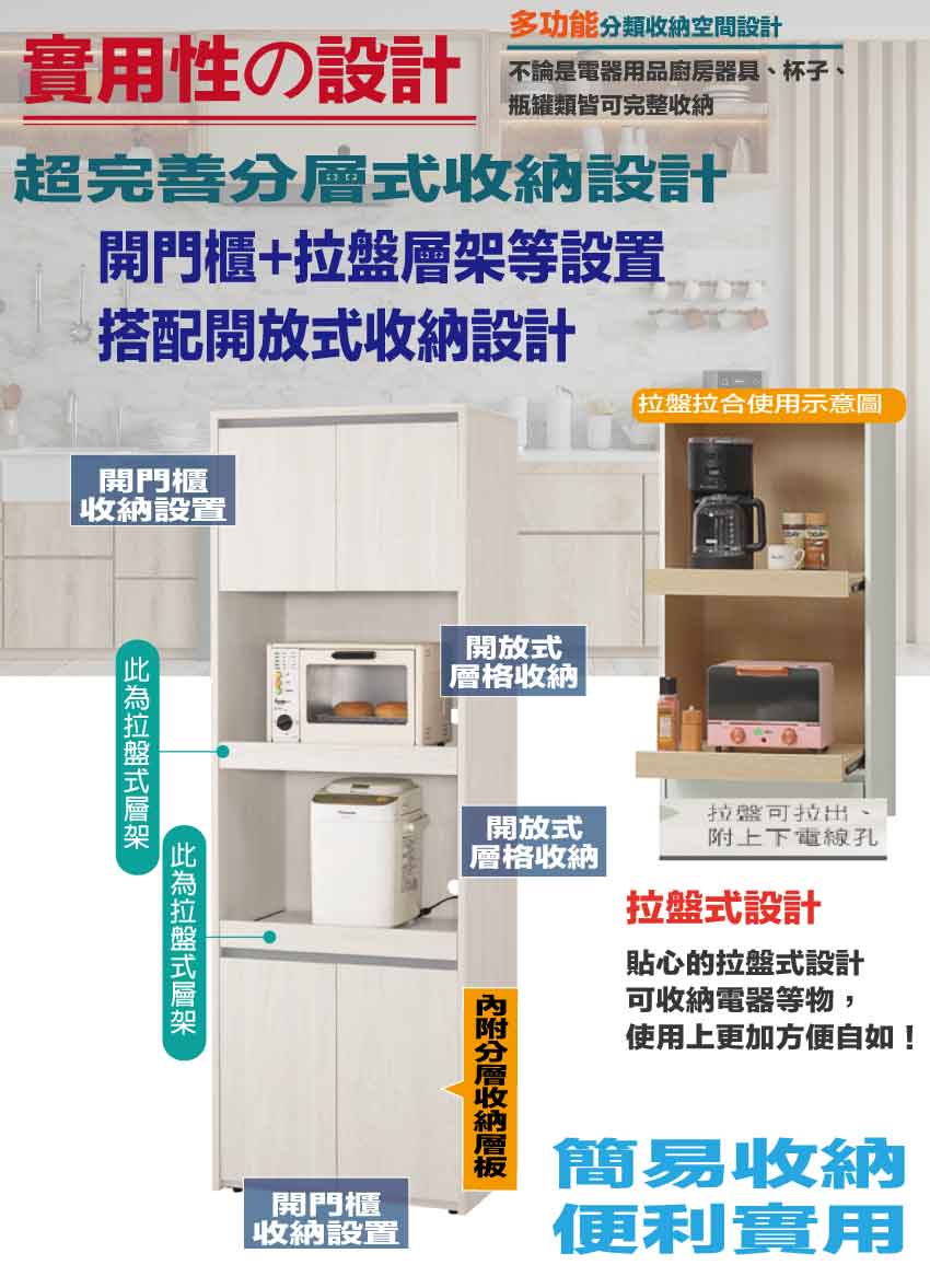 搭配採用開門櫃+拉盤層架+內&外開放層格等收納空間設計