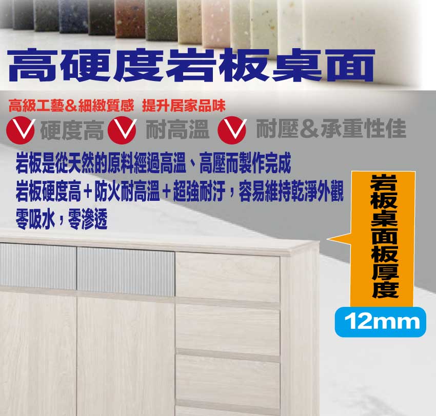 採用防蛀木心板+烤漆五金腳座+防夾手緩衝門片五金+五金滑軌結構+12mm高硬度岩板桌面板等安心材質製造
