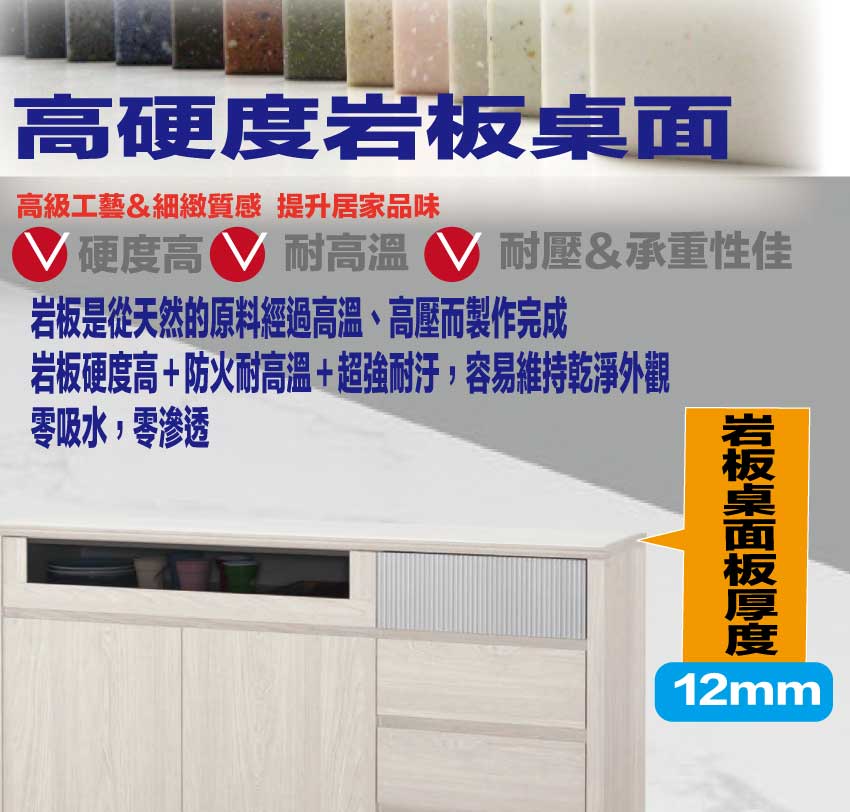 採用防蛀木心板+烤漆五金腳座+防夾手緩衝門片五金+五金滑軌結構+12mm高硬度岩板桌面板等安心材質製造