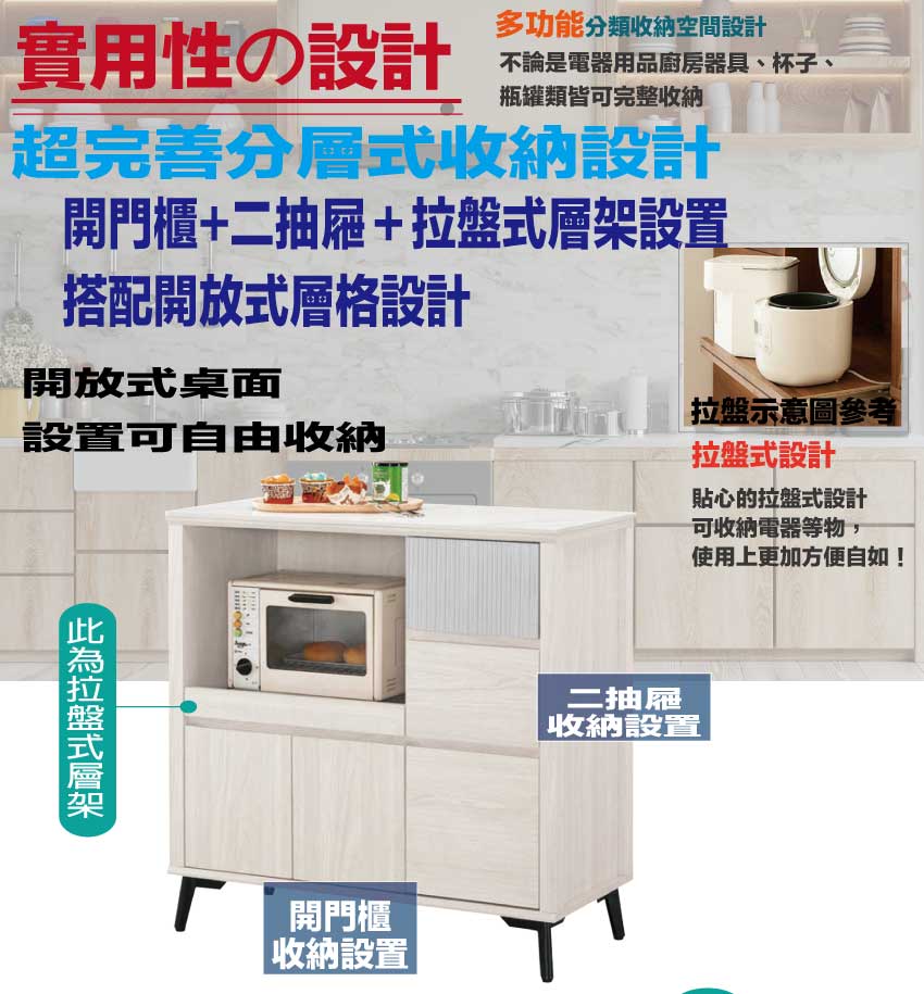 搭配採用開門櫃+三抽屜+拉盤層架+開放層格等收納空間設計