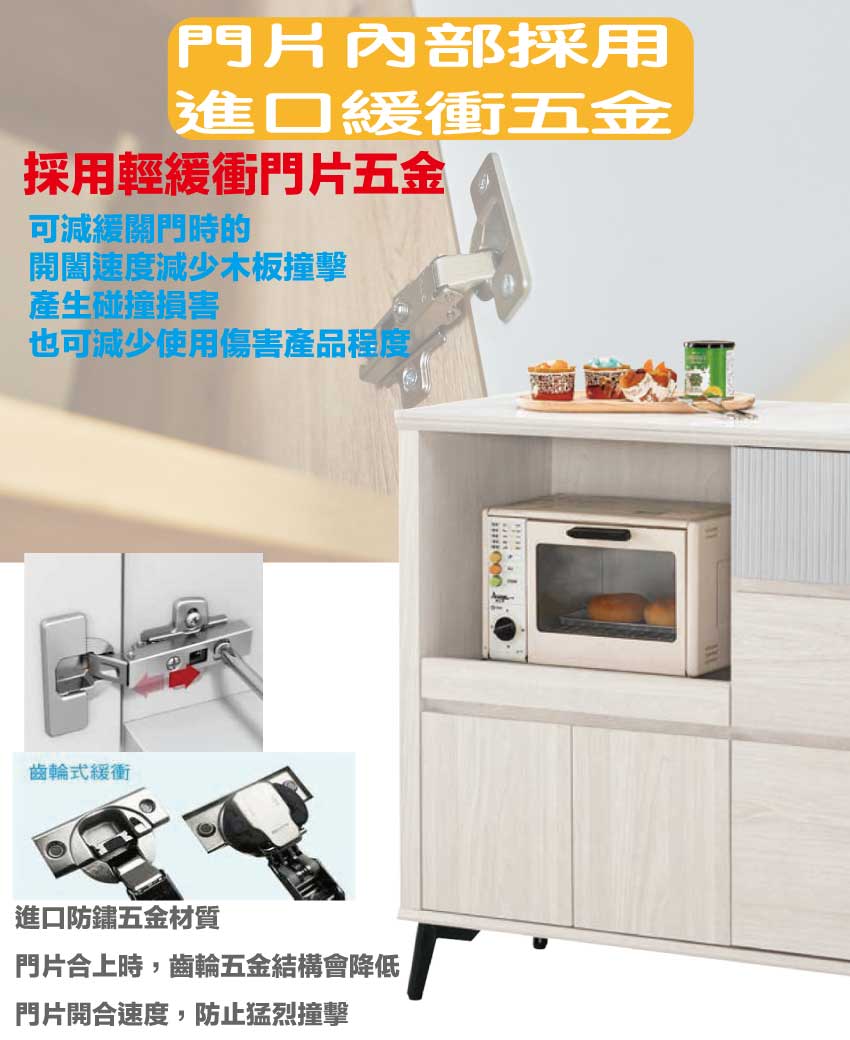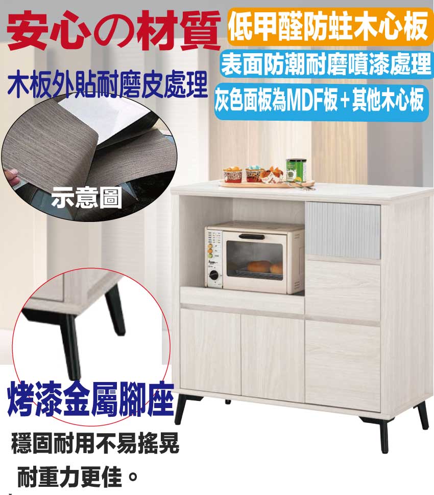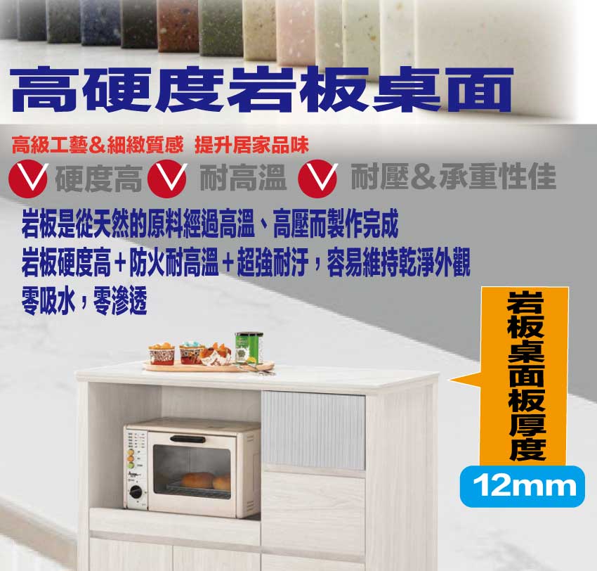 材質:防蛀木心板+防潮MDF板材(灰色耐磨面板)+烤漆五金腳座+防夾手緩衝門片五金+五金滑軌結構+12mm高硬度岩板桌面板