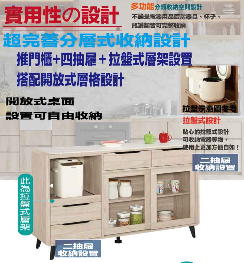 搭配採用推門櫃+四抽屜+拉盤層架+開放層格等收納空間設計