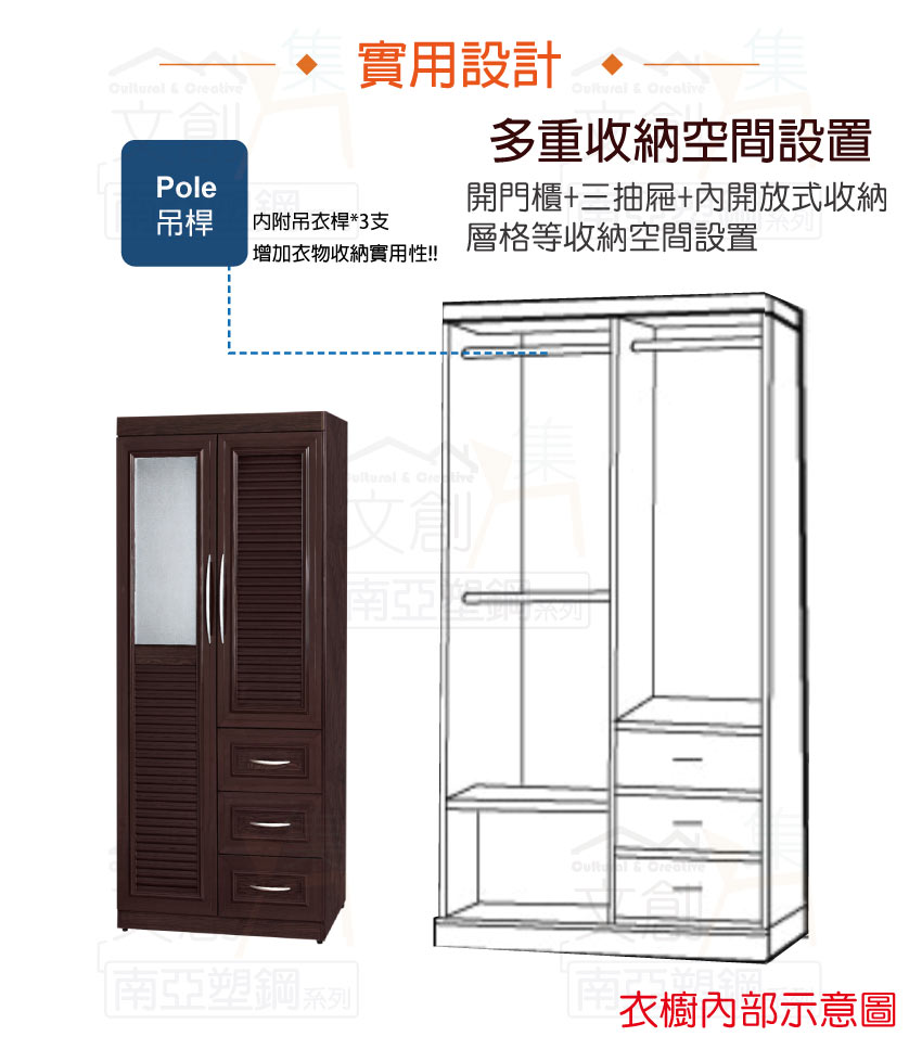 【文創集】谷利 環保3尺南亞塑鋼二門百葉三抽高衣櫃/收納櫃 產品採用第一品牌-台製南亞塑鋼舒美板+噴砂壓克力+五金滑軌結構等材質,整體材質採用防水+防燃+無甲醛安心塑鋼材質製造 ,搭配開門櫃+吊衣桿+三抽屜+內開放式收納等便利設計,防止受潮,增加支撐力,堅固不會塌陷,全由專人配送到家,專業安心服務,替你省下更多時間!