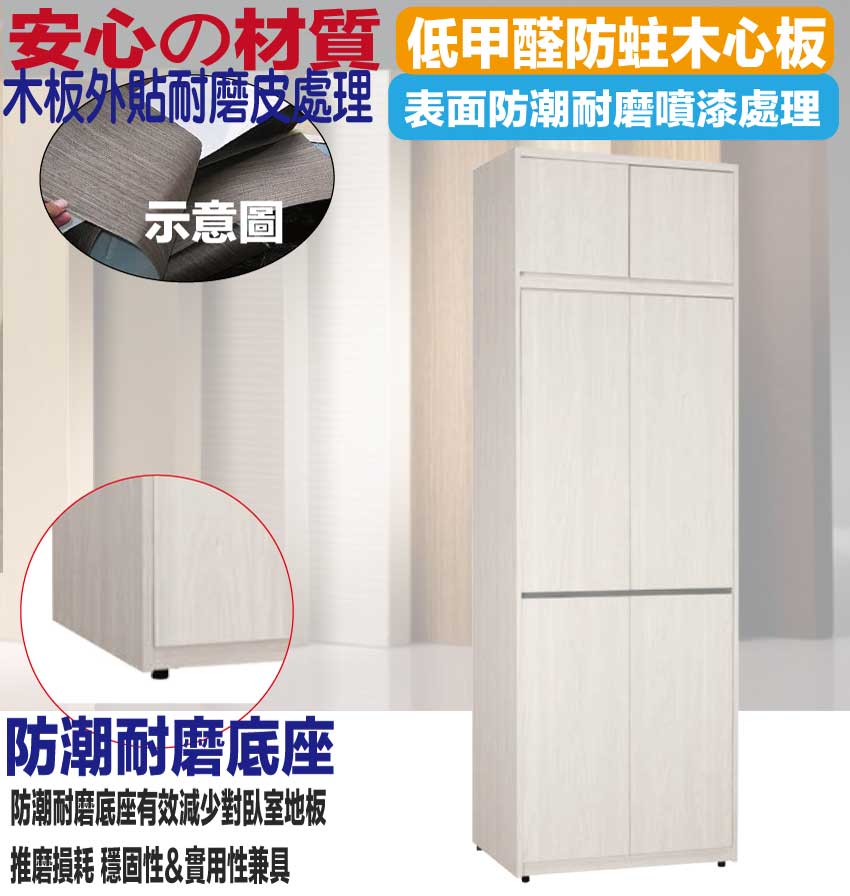 【文創集】華爾2.7尺六門雙吊加高衣櫃 淺橡木紋色系+安心材質製造,使用放心+搭配居家更便利,採用防蛀木心板+防潮耐磨底座+防夾手緩衝門片五金等安心材質製造 ,外層採用防潮耐磨噴漆處理搭配採用開門櫃+吊衣桿+內開放層格等收納空間設計,全由專人配送到家,專業安心服務,替你省下更多時間!