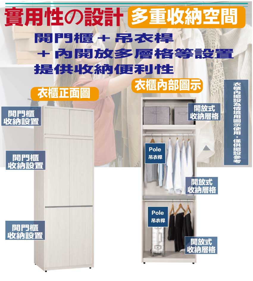 搭配採用開門櫃+吊衣桿+內開放層格等收納空間設計